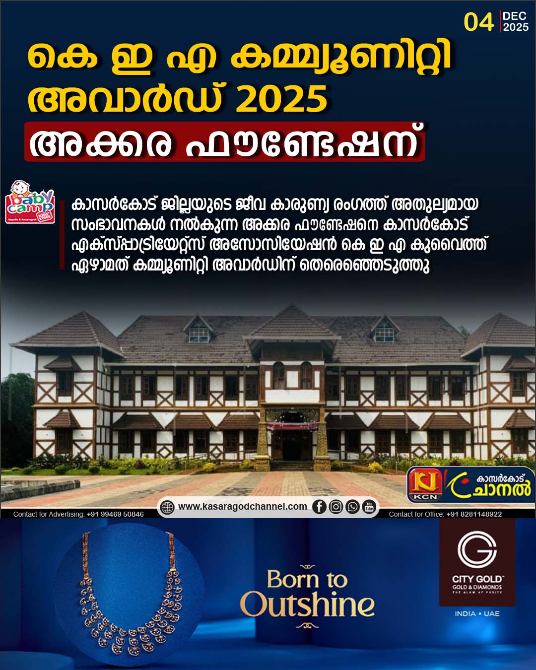 ഡിസംബര് 5 ന് അബ്ബാസിയ ഇന്ത്യന് സെന്ട്രല് സ്കൂള് ഓപ്പണ് ഓഡിറ്റോറിയത്തില് വെച്ചു നടക്കുന്ന 'കാസറഗോഡ് ഉത്സവ് 2025' പരിപാടിയില് വെച്ച് അവാര്ഡ് വിതരണം ചെയ്യുമെന്നും പ്രവാസി സമൂഹത്തിന്റെ സാമൂഹിക പ്രതിബദ്ധതയുടെ പ്രതീകമായ ചെയര്മാന് അബ്ദുല് അസീസ് അക്കര അവാര്ഡ് സ്വീകരിക്കുമെന്നും ഭാരവാഹികള് കൂട്ടിച്ചേര്ത്തു.