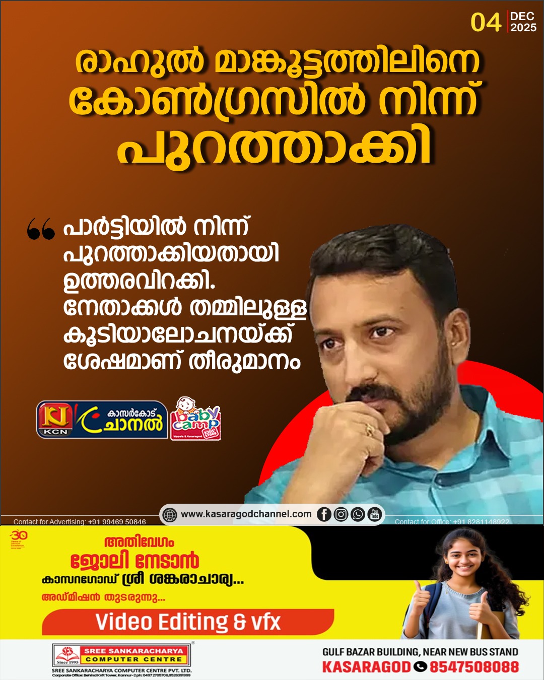 നിലവില് സസ്പെന്ഷനിലുള്ള രാഹുല് മാങ്കൂട്ടത്തിലിനെ ഉയര്ന്ന പരാതികളുടെയും രജിസ്റ്റര് ചെയ്ത കേസുകളുടെയും അടിസ്ഥാനത്തില് കോണ്ഗ്രസിന്റെ പ്രാഥമിക അംഗത്വത്തില് നിന്നും പുറത്താക്കിയതായി കെപിസിസി പ്രസിഡന്റ് സണ്ണി ജോസഫ് എംഎല്എ അറിയിച്ചു.