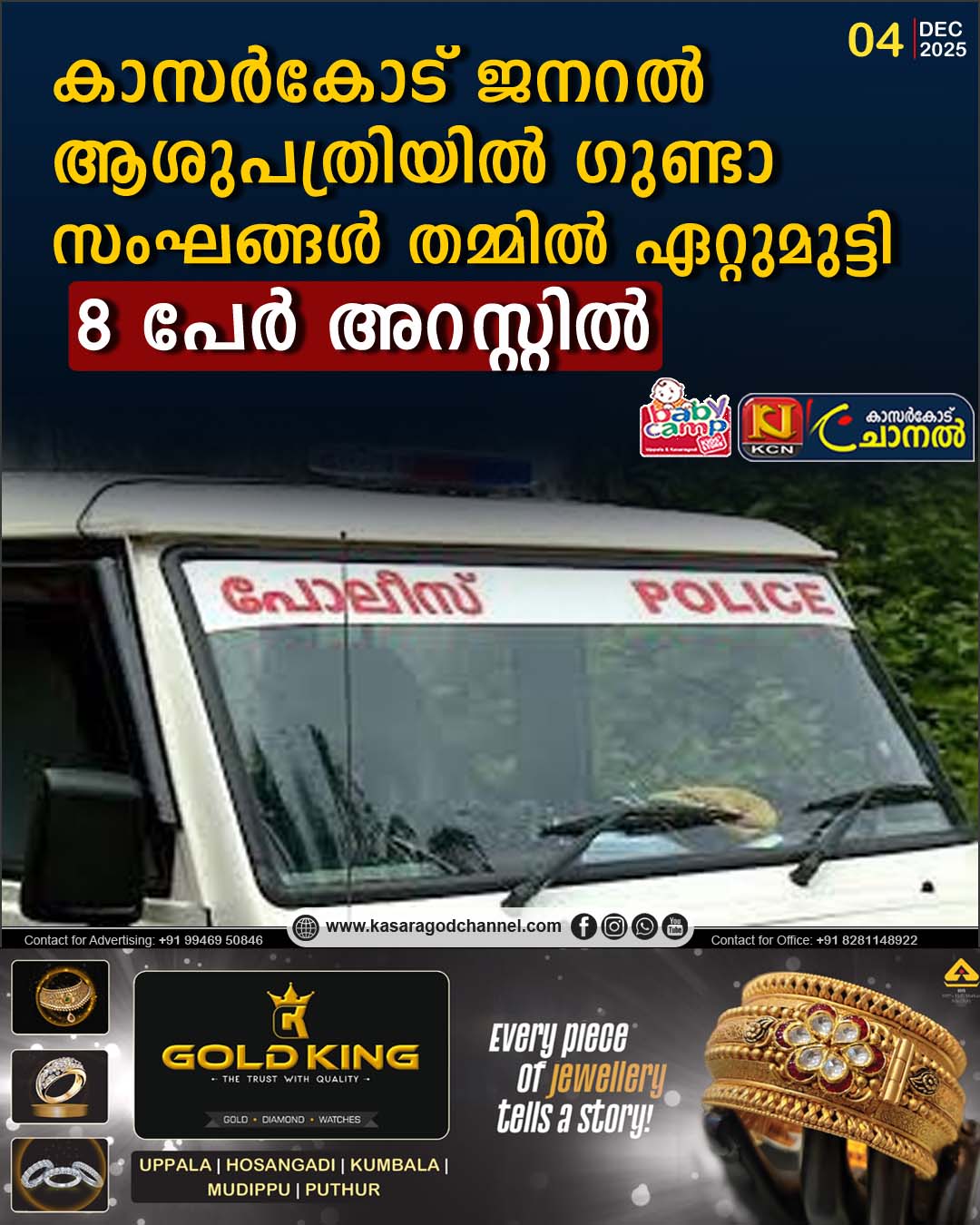 കാസര്ഗോഡ് ജനറല് ആശുപത്രിയില് ഗുണ്ടാ സംഘങ്ങള് തമ്മില് ഏറ്റുമുട്ടി; 8 പേര് അറസ്റ്റില്