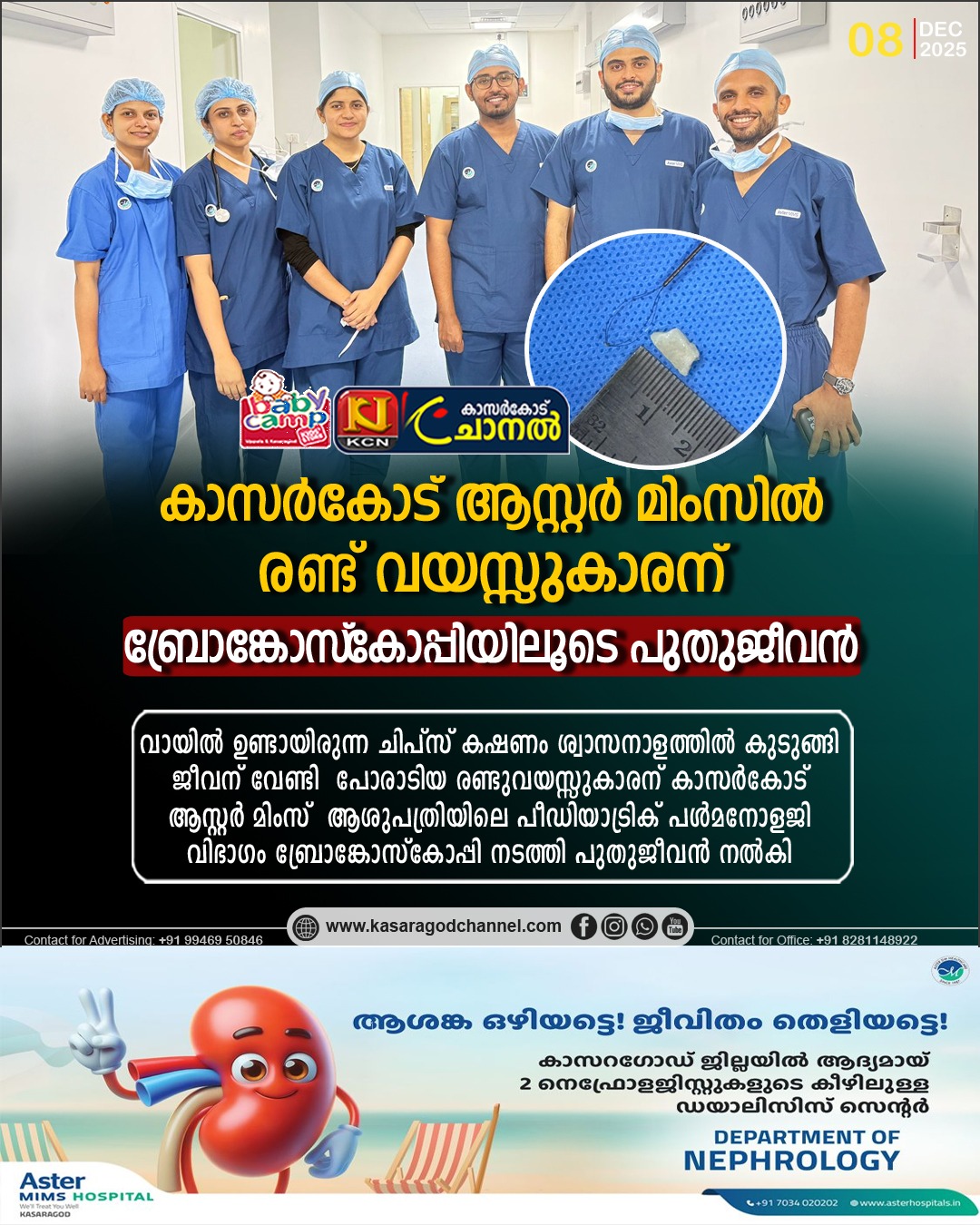 വായില് ഉണ്ടായിരുന്ന ചിപ്സ് കഷണം ശ്വാസനാളത്തില് കുടുങ്ങി ജീവന് വേണ്ടി പോരാടിയ രണ്ടുവയസ്സുകാരന് ആസ്റ്റര് മിംസ് ആശുപത്രി കാസറഗോഡിലെ പീഡിയാട്രിക് പള്മനോളജി വിഭാഗം ബ്രോങ്കോസ്കോപ്പി നടത്തി പുതുജീവന് നല്കി. അടിയന്തര ഘട്ടത്തില് നടത്തിയ കൃത്യമായ ഇടപെടലാണ് കുഞ്ഞിന്റെ ജീവന് രക്ഷിച്ചത്.