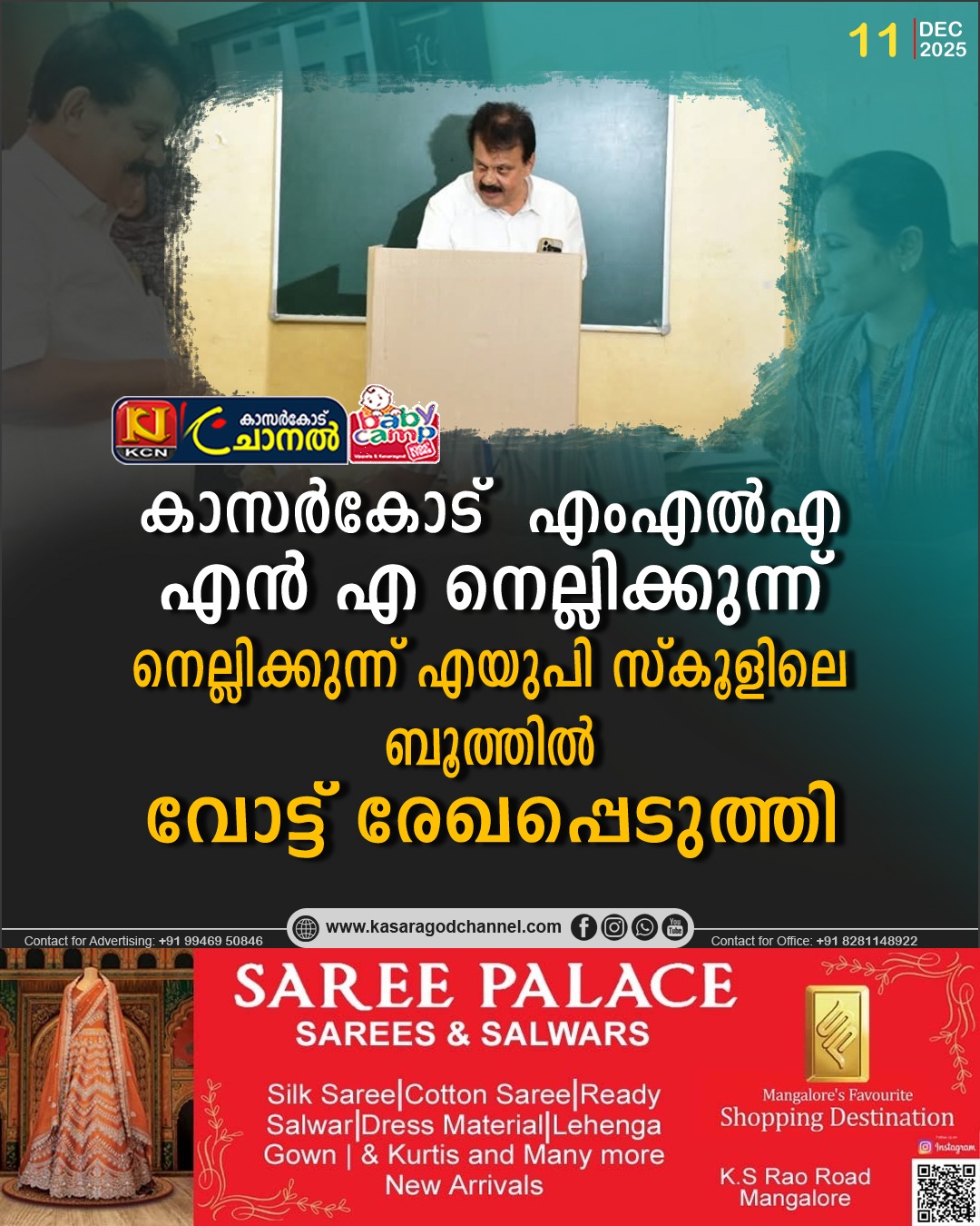 കാസര്കോട് എംഎല്എ എന് എ നെല്ലിക്കുന്ന്, നെല്ലിക്കുന്ന് എയുപി സ്കൂളിലെ ബൂത്തില് വോട്ട് രേഖപ്പെടുത്തിBy kcnchannel / December 11, 2025