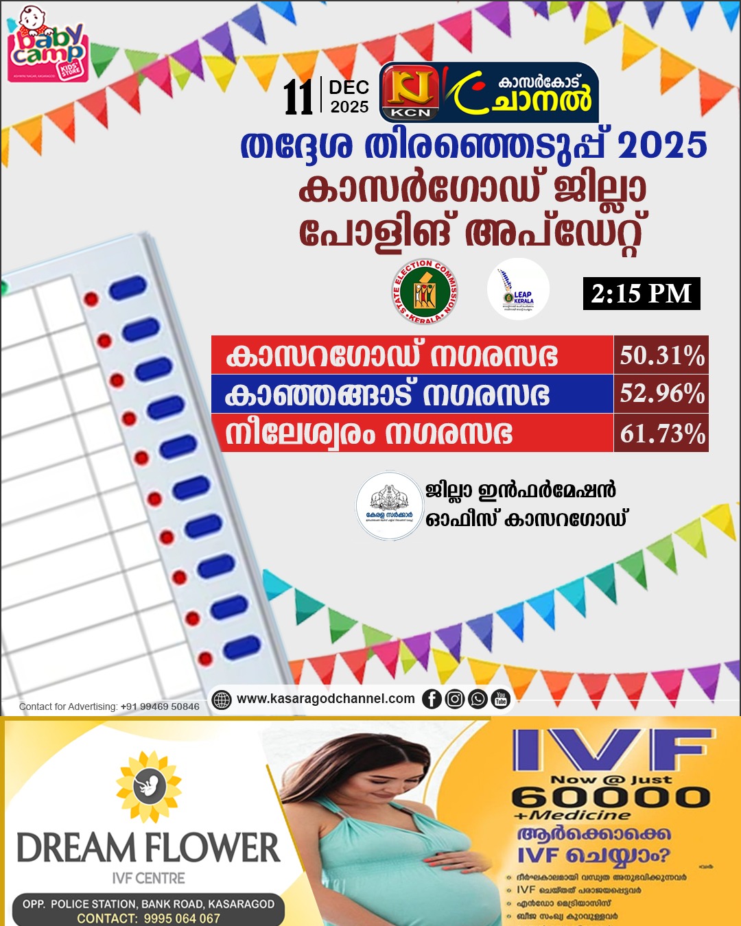 ജില്ലയില് പോളിംഗ് – ഉച്ചയ്ക്ക് 2.15 വരെBy kcnchannel / December 11, 2025 കാഞ്ഞങ്ങാട് :52.96%കാസര്കോട് :50.31%നീലേശ്വരം :61.73%