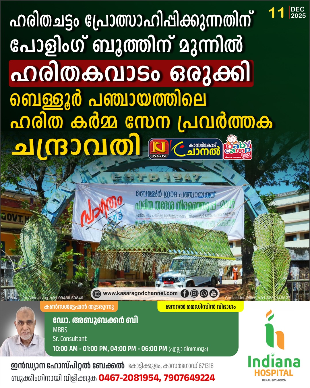 ഹരിത കര്മ്മ സേന പ്രവര്ത്തകയായ ചന്ദ്രാവതിയാണ് ഹരിതചട്ടം പ്രോത്സാഹിപ്പിക്കുന്നതിന് പോളിംഗ് ബൂത്തിന് മുന്നില് കവാടം ഒരുക്കിയത്
