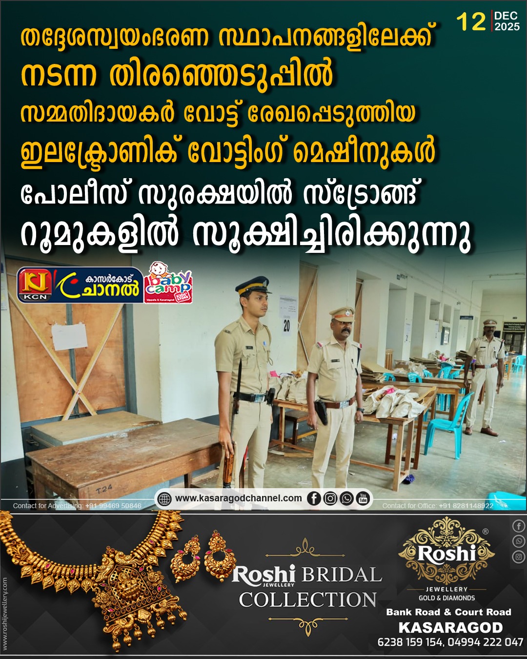 തദ്ദേശസ്വയംഭരണ സ്ഥാപനങ്ങളിലേക്ക് നടന്ന തിരഞ്ഞെടുപ്പില് സമ്മതിദായകര് വോട്ട് രേഖപ്പെടുത്തിയ ഇലക്ട്രോണിക് വോട്ടിംഗ് മെഷീനുകള് പോലീസ് സുരക്ഷയില് സ്ട്രോങ്ങ് റൂമുകളില് സൂക്ഷിച്ചിരിക്കുന്നു.