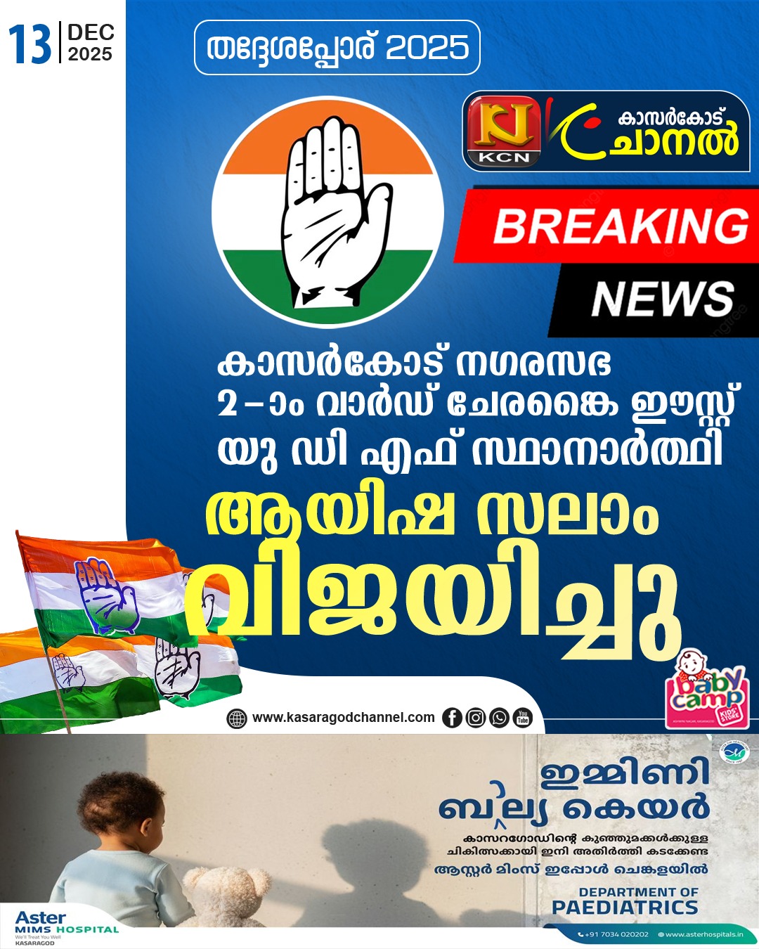 തദ്ദേശ തെരഞ്ഞെടുപ്പ്: കാസര്കോട് നഗരസഭ 2-ാം വാര്ഡ് ചേരങ്കൈ ഈസ്റ്റ്് യു ഡി എഫ് സ്ഥാനാര്ത്ഥി ആയിഷ സലാം വിജയിച്ചുBy kcnchannel / December 13, 2025
