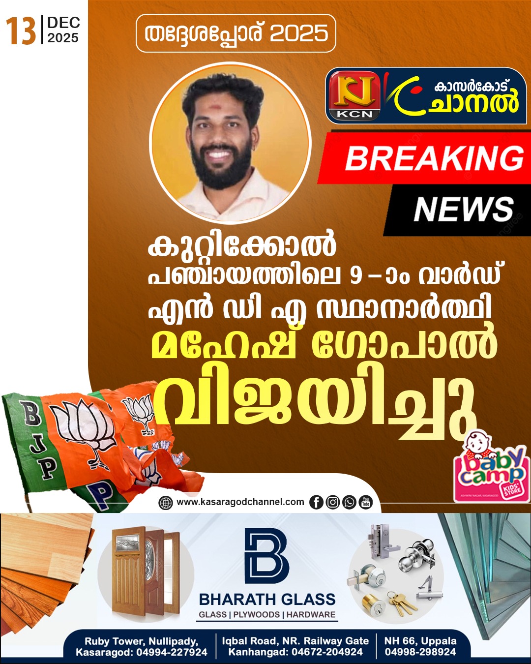 കുറ്റിക്കോല് പഞ്ചായത്തിലെ ഒന്പതാം വാര്ഡില് ബിജെപി സ്ഥാനാര്ത്ഥി മഹേഷ് ഗോപാല് വിജയിച്ചുBy kcnchannel / December 13, 2025