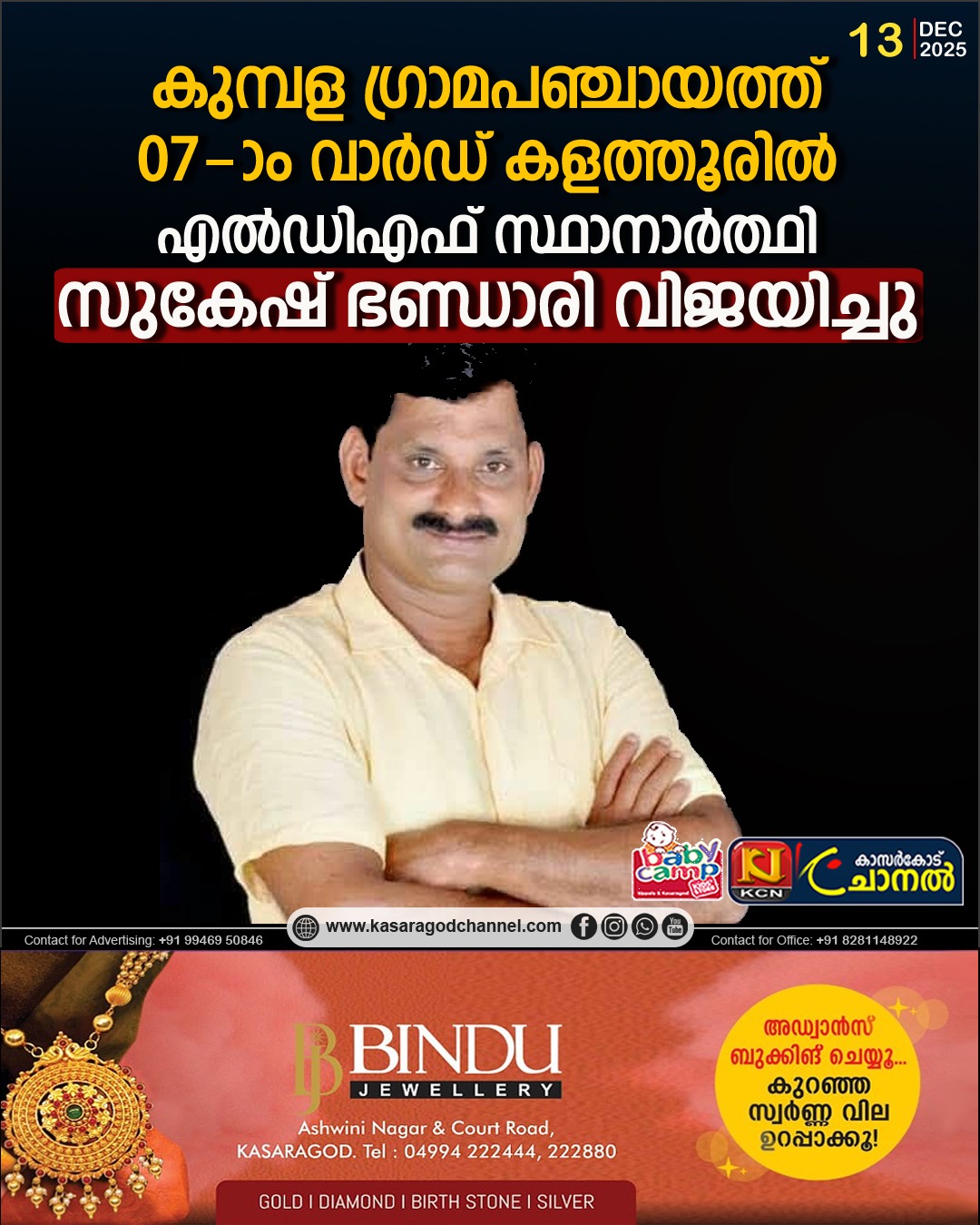 കുമ്പള ഗ്രാമപഞ്ചായത്ത് 07-ാം വാർഡ് കളത്തൂരില് എല്ഡിഎഫ് സ്ഥാനാര്ത്ഥി സുകേഷ് ഭണ്ഡാരി വിജയിച്ചുBy kcnchannel / December 13, 2025