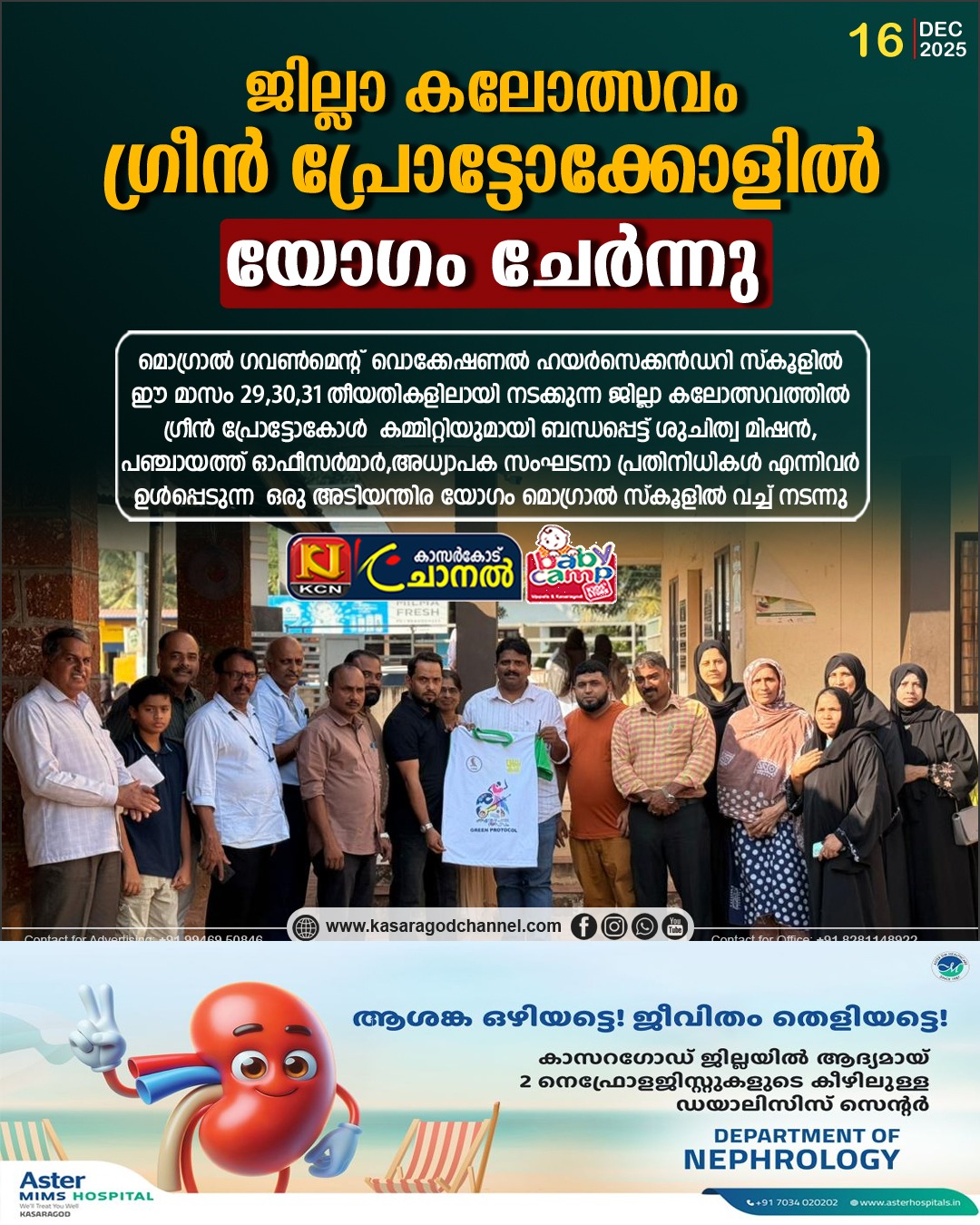 മൊഗ്രാല്.മൊഗ്രാല് ഗവണ്മെന്റ് വൊക്കേഷണല് ഹയര്സെക്കന്ഡറി സ്കൂളില് ഈ മാസം 29,30,31 തീയതികളിലായി നടക്കുന്ന ജില്ലാ കലോത്സവത്തില് ഗ്രീന് പ്രോട്ടോകോള് കമ്മിറ്റിയുമായി ബന്ധപ്പെട്ട് ശുചിത്വ മിഷന്,പഞ്ചായത്ത് ഓഫീസര്മാര്,അധ്യാപക സംഘടനാ പ്രതിനിധികള് എന്നിവര് ഉള്പ്പെടുന്ന ഒരു അടിയന്തിര യോഗം മൊഗ്രാല് സ്കൂളില് വച്ച് നടന്നു.