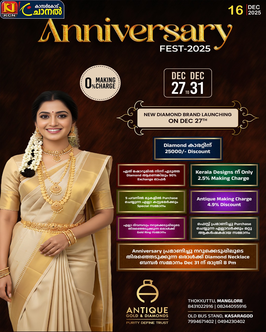 *ആനിവേഴ്സറി പ്രമാണിച്ച് നറുക്കെടുപ്പിലൂടെ തിരഞ്ഞെടുക്കുന്ന ഒരാള്ക്ക് ഡയമണ്ട് നെക്ലൈസ് ബംബര് സമ്മാനം ഡിസംബര് 31ന് രാത്രി 8 മണിക്ക്