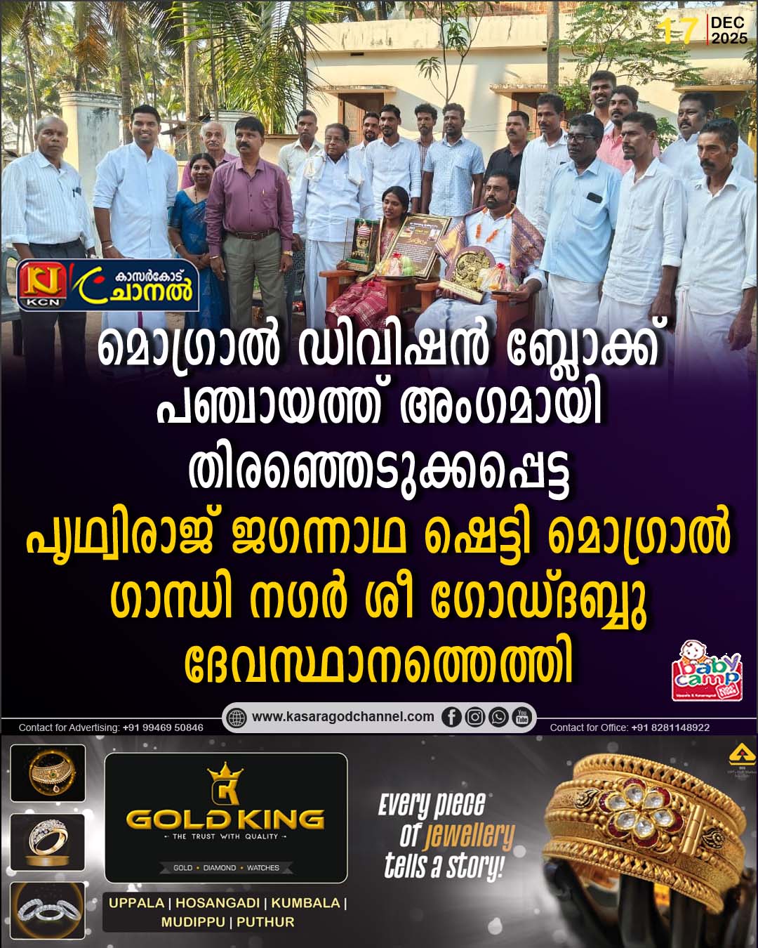 ഫോട്ടോ:ബ്ലോക്ക് പഞ്ചായത്ത് മൊഗ്രാല് ഡിവിഷനില് നിന്ന് തെരഞ്ഞെടുക്കപ്പെട്ട പൃഥ്വിരാജ് ജഗന്നാഥ ഷെട്ടി മൊഗ്രാല് ഗാന്ധി നഗര് ശ്രീ ഗോഡ്ദബ്ബു ദേവ സ്ഥാനത്ത് സന്ദര്ശനം നടത്തി.