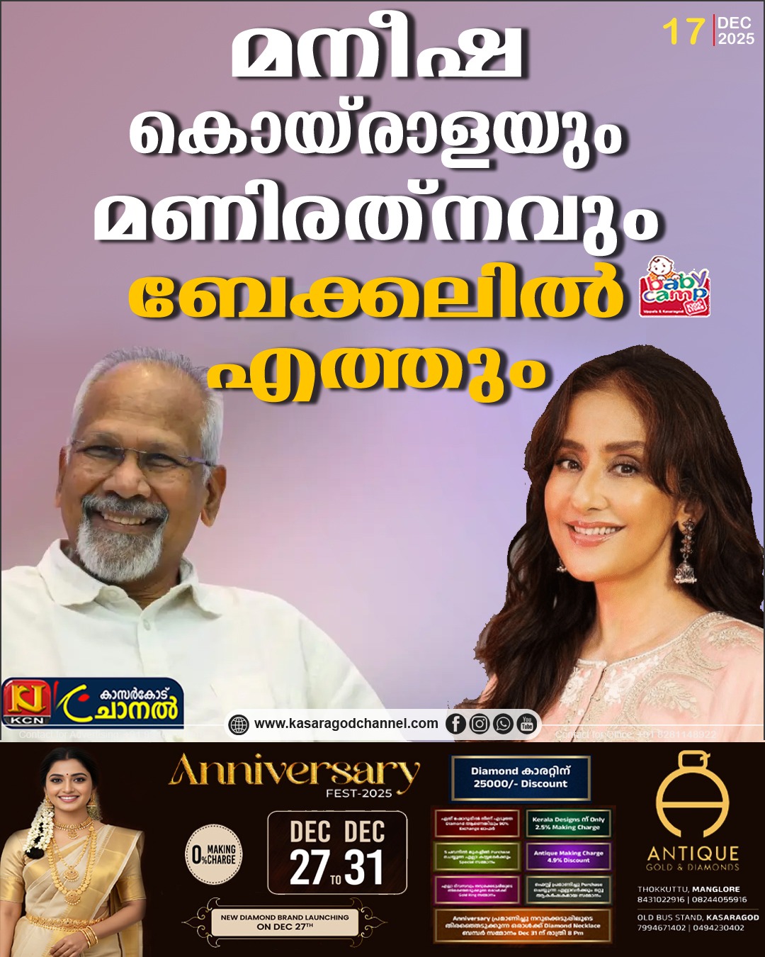 കാസര്കോട്:സിനിമാ പ്രേക്ഷരുടെ ഹൃദയത്തില് ഇടം പിടിച്ച ‘ബോംബെ’ യുടെ സംവിധായകന് മണിരത്നവും നായിക മനീഷ കൊയ്രാളയും വീണ്ടും ആ മനോഹരമായ ലൊക്കേഷനില് എത്തുന്നു. ഡിസംബര് 20 ന് ഒരുവര്ക്കും ഒപ്പം ഒപ്പം ഛായാഗ്രഹകന് രാജീവ് മേനോനും ബേക്കലില് എത്തും. മുന്കൂട്ടി നിശ്ചയിച്ച വിദേശ പരിപാടിയില് മാറ്റം വന്നാല് അരവിന്ദ് സ്വാമിയും ബേക്കലില് എത്തും.