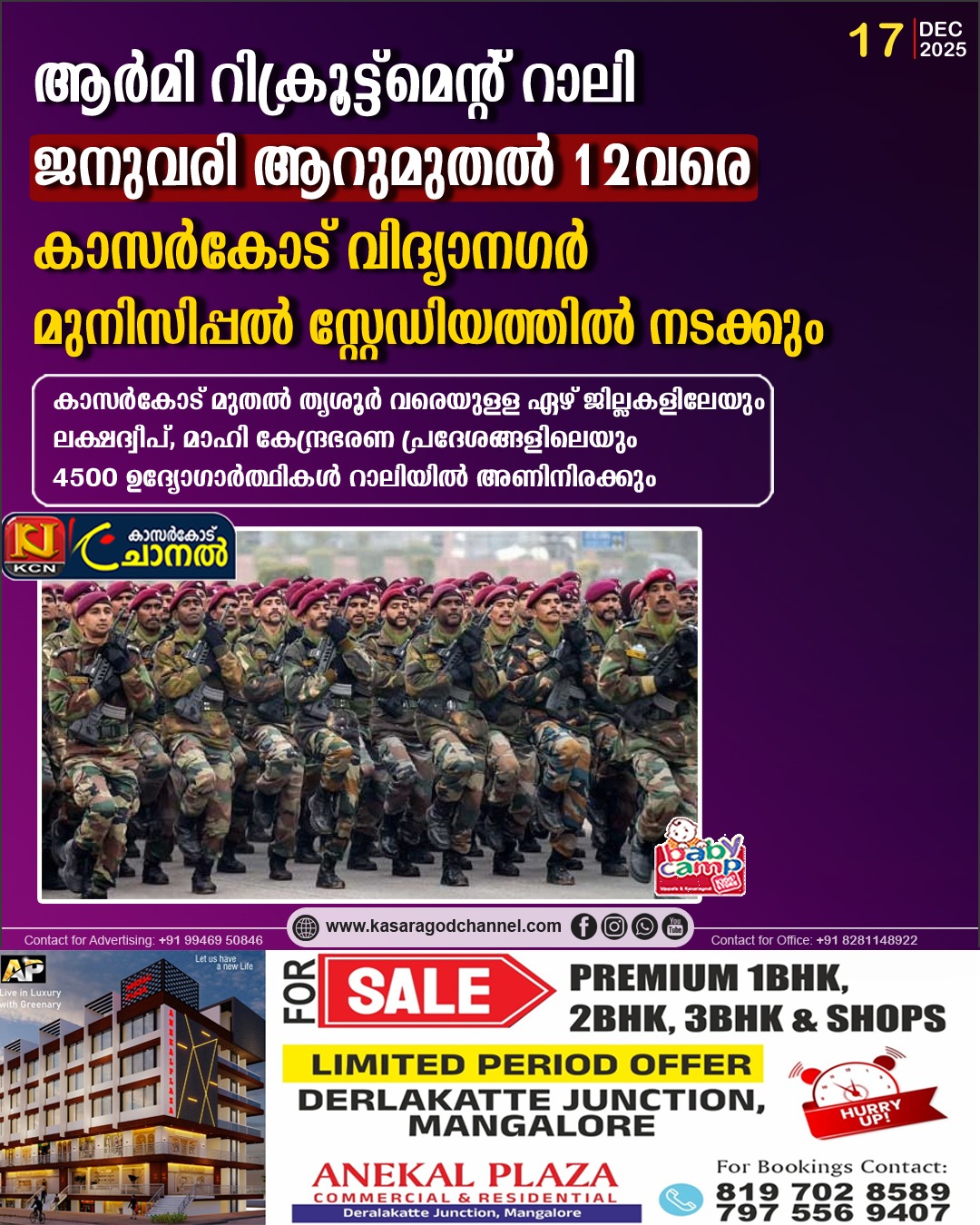 ആര്മി റിക്രൂട്ട്മെന്റ് റാലി ജനുവരി ആറുമുതല് 12വരെ കാസര്കോട് വിദ്യാനഗര് മുനിസിപ്പല് സ്റ്റേഡിയത്തില് നടക്കും.