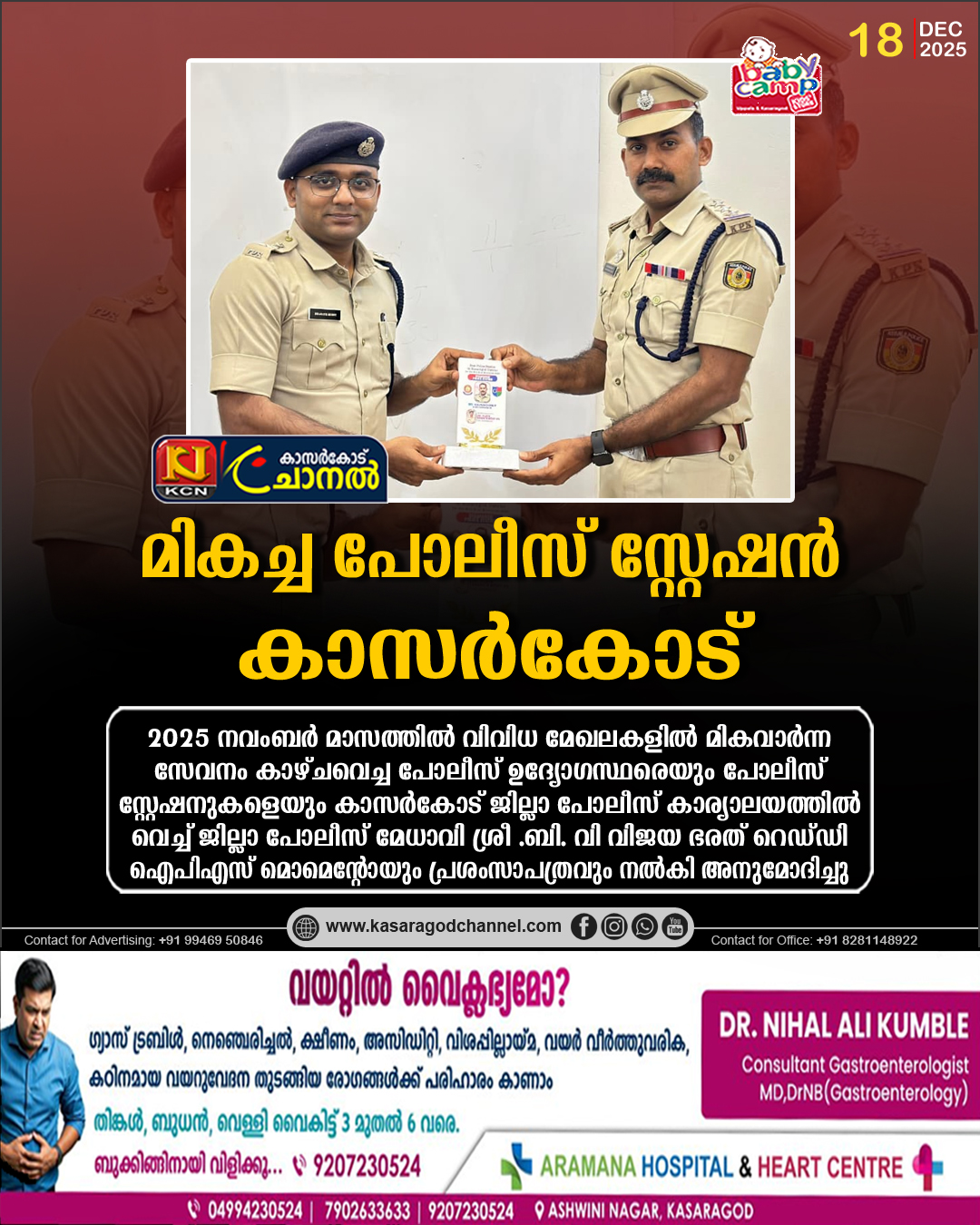 2025 നവംബര് മാസത്തില് വിവിധ മേഖലകളില് മികവാര്ന്ന സേവനം കാഴ്ചവെച്ച പോലീസ് ഉദ്യോഗസ്ഥരെയും പോലീസ് സ്റ്റേഷനുകളെയും കാസറഗോഡ് ജില്ലാ പോലീസ് കാര്യാലയത്തില് വെച്ച് ജില്ലാ പോലീസ് മേധാവി ശ്രീ .ബി. വി വിജയ ഭരത് റെഡ്ഡി ഐപിഎസ് മൊമെന്റോയും പ്രശംസാപത്രവും നല്കി അനുമോദിച്ചു. വിവിധ മേഖലകളിലെ മികവുറ്റ പ്രകടനം കാഴ്ച വെച്ചതിന് ജില്ലയിലെ മികച്ച പോലിസ് സ്റ്റേഷനായി കാസറഗോഡ് പോലീസ് സ്റ്റേഷന് തെരഞ്ഞെടുക്കപ്പെട്ടു ഇന്സ്പെക്ടര് നളിനാക്ഷന് പി ജില്ലാ പോലീസ് മേധാവിയില് നിന്നും ട്രോഫി ഏറ്റു വാങ്ങി രണ്ടാമതായി ബേക്കല് പോലീസ് സ്റ്റേഷന് തെരഞ്ഞെടുക്കപ്പെട്ടു ഇന്സ്പെക്ടര് രഞ്ജിത്ത് രവീന്ദ്രന് ജില്ലാ പോലീസ് മേധാവിയില് നിന്നും ട്രോഫി ഏറ്റു വാങ്ങി. കോമ്പിങ് ഓപ്പറേഷനിലെ മികച്ച പോലീസ് സ്റ്റേഷനായി ബേക്കല് പോലീസ് സ്റ്റേഷനും( ഇന്സ്പെക്ടര് SHO രഞ്ജിത്ത് രവീന്ദ്രന്) രണ്ടാമതായി മേല്പറമ്പ് പോലീസ് സ്റ്റേഷനും(ഇന്സ്പെക്ടര് SHO രാഘവന് എന് പി) തെരഞ്ഞെടുക്കപ്പെട്ടു. വെള്ളരിക്കുണ്ട് ഇന്സ്പെക്ടര് സതീഷ് കെ പി, ബദിയടുക്ക ഇന്സ്പെക്ടര് സന്തോഷ് കുമാര് എ, നീലേശ്വരം ഇന്സ്പെക്ടര് നിബിന് ജോയ്, മേല്പറമ്പ് ഇന്സ്പെക്ടര് രാഘവന് എന് പി, കാസറഗോഡ് സ്പെഷ്യല് ബ്രാഞ്ച് സബ് ഇന്സ്പെക്ടര് സദാശിവന് എന്നിവര് മറ്റ് പ്രവര്ത്തന മികവിനുള്ള പ്രശംസാപത്രവും ജില്ലാ പോലീസ് മേധാവിയില് നിന്നും ഏറ്റുവാങ്ങി