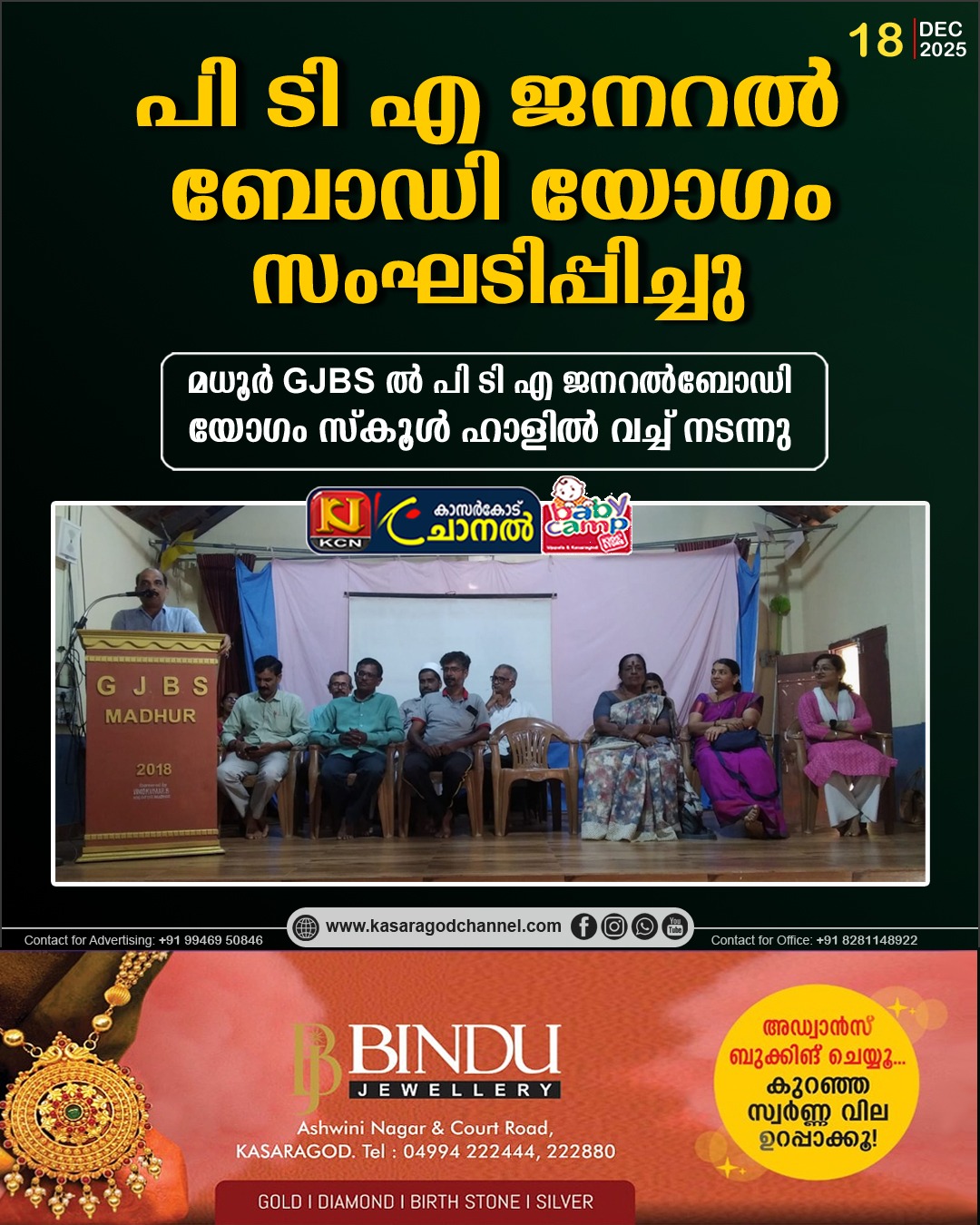 മധൂര് : മധൂര് GJBS ല് P T A ജനറല്ബോഡി യോഗം സ്കൂള് ഹാളില് വച്ച് നടന്നു. യോഗത്തില് പിടിഎ പ്രസിഡണ്ട് നരേന്ദ്ര. കെ.പി അധ്യക്ഷത വഹിച്ചു. സ്കൂള് ഹെഡ്മാസ്റ്റര് വിനോദ് കുമാര് ബി സ്വാഗതം ആശംസിച്ചു. തുടര്ന്ന് അടുത്തമാസം നടക്കുന്ന കബ്- ബുള് ബുള് ഉത്സവത്തെക്കുറിച്ചും വാര്ഷികാഘോഷത്തെക്കുറിച്ചും ഹെഡ്മാസ്റ്റര് വിശദീകരിച്ചു. യോഗത്തില് പിടിഎ അംഗങ്ങള്, അധ്യാപകര്,രക്ഷിതാക്കള്, കേരള സ്കൗട്ട് ആന്ഡ് ഗൈഡ് ജില്ലാ സെക്രട്ടറി ഭാര്ഗവിക്കുട്ടി, ബുള്ബുള് ജില്ലാ കമ്മീഷണര് ജ്യോതിലക്ഷ്മി കേരള സ്കൗട്ട് ആന്ഡ് ഗെയിംസ് ജില്ലാ ജോയിന് സെക്രട്ടറി കിരണ് പ്രസാദ് എന്നിവര് പങ്കെടുത്തു. സ്റ്റാഫ് സെക്രട്ടറി ശശികല നന്ദിയും പറഞ്ഞു