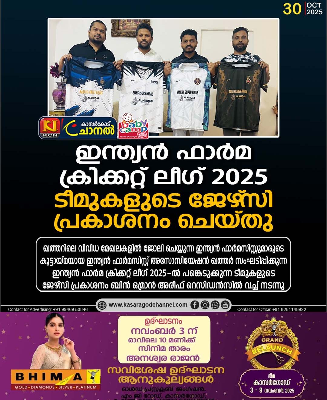 ലീഗില് പങ്കെടുക്കുന്ന സണ്റൈസേഴ്സ് ഹിലാല്, വാക്ര സൂപ്പര് കിംഗ്സ്, റോയല് ചാലഞ്ചേഴ്സ് ബിന് ഒമ്രാന്, മാര്ക്കിയ നൈറ്റ് റൈഡേഴ്സ് എന്നീ ടീമുകളുടെ ജഴ്സികളാണ് ചടങ്ങില് പ്രകാശനം ചെയ്തത്.
