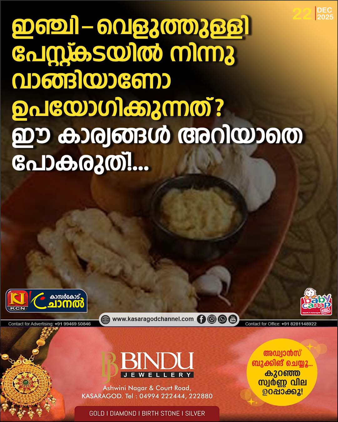 നമ്മുടെ വീടുകളില് തയ്യാറാക്കുന്ന പല കറികളുടെയും ഒഴിച്ച് കൂടാനാകാത്ത ചേരുവയാണ് ഇഞ്ചിയും വെളുത്തുള്ളിയും. മുന്പെല്ലാം ഇത് വീട്ടില് തന്നെ അരച്ചാണ് കറികളില് ചേര്ത്തിരുന്നതെങ്കില് ഇന്ന് കടകളില് നിന്ന് റെഡി ടു യൂസ് ജിഞ്ചര് ഗാര്ലിക് പേസ്റ്റ് വാങ്ങാന് കിട്ടും. ഇഞ്ചി തൊലി കളഞ്ഞ്, വെളുത്തുള്ളി പൊളിച്ച് പിന്നെയത് എല്ലാം കൂടി മിക്സിയില് ഇട്ട് അടിച്ച് വരുന്ന നേരവും മെനക്കേടുമെല്ലാം ലാഭിക്കാന് ഈ ജിഞ്ചര് ഗാര്ലിക് പേസ്റ്റ് സഹായിക്കുമെന്നതൊക്കെ ശരി. എന്നാല് ഇത് 100 ശതമാനം സുരക്ഷിതമല്ലെന്ന് ആരോഗ്യ വിദഗ്ധര് പറയുന്നു. മറ്റ് പല പായ്ക്ക് ചെയ്ത ഭക്ഷണങ്ങളെയും പോലെ പ്രിസര്വേറ്റീവുകളും അഡിറ്റീവുകളും രാസവസ്തുക്കളും ഇതിലും അടങ്ങിയിട്ടുണ്ടാകുമെന്നതാണ് കാരണം.