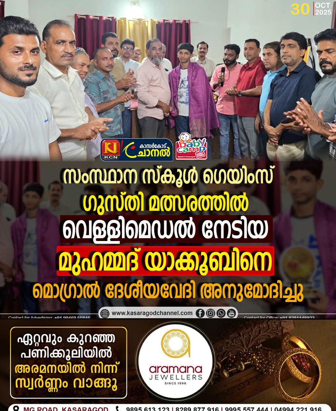 സംസ്ഥാന സ്കൂള് ഗെയിംസ് : ഗുസ്തി മത്സരത്തില് വെള്ളിമെഡല് നേടിയ മുഹമ്മദ് യാക്കൂബിനെ മൊഗ്രാല് ദേശീയവേദി അനുമോദിച്ചു