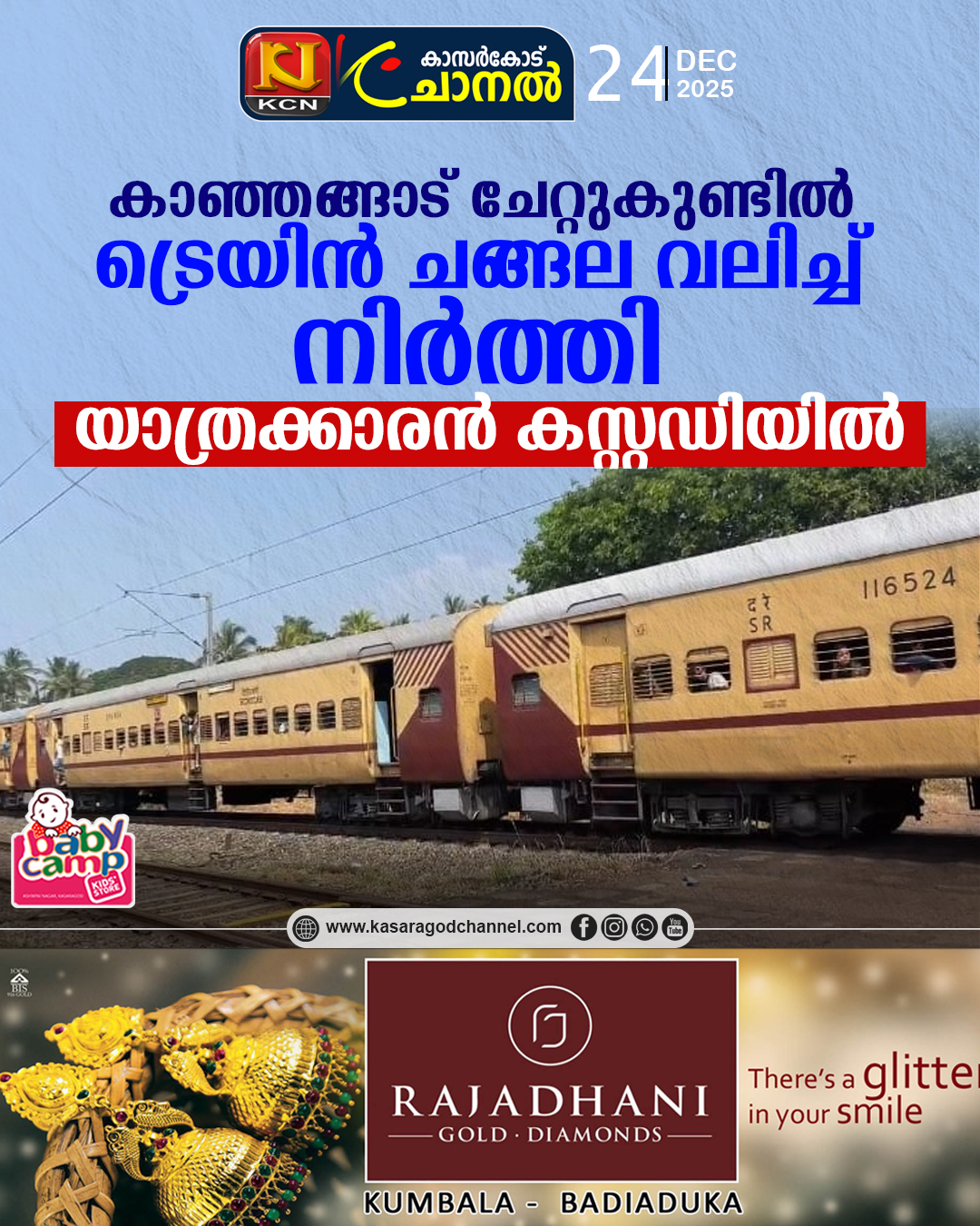 കാഞ്ഞങ്ങാട് ചേറ്റുകുണ്ടില് ട്രെയിന് ചങ്ങല വലിച്ച് നിര്ത്തി യാത്രക്കാരന് കസ്റ്റഡിയില്
