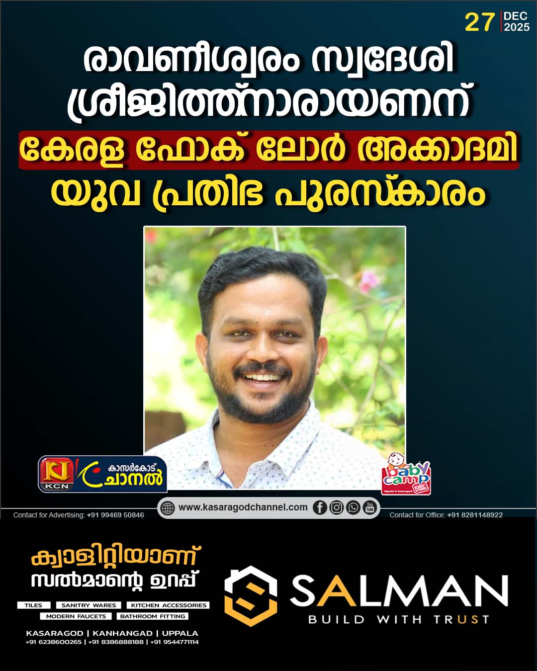 രാവണീശ്വരം സ്വദേശി ശ്രീജിത്ത് നാരായണന് കേരള ഫോക് ലോര് അക്കാദമി യുവ പ്രതിഭ പുരസ്കാരം