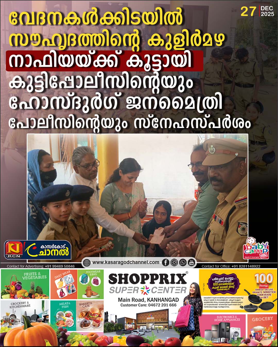 ഒരു വര്ഷത്തിലധികമായി ക്ലാസ് മുറിയുടെ ആരവങ്ങളില് നിന്നും കൂട്ടുകാരുടെ ചിരികളില് നിന്നും അകന്ന്, വേദനയുടെ ലോകത്ത് ഒറ്റപ്പട്ടുപോയ ഫാത്തിമത്ത് നാഫിയയ്ക്ക് ആശ്വാസത്തിന്റെ തണലുമായി പ്രിയപ്പെട്ട കൂട്ടുകാരെത്തി. ഹോസ്ദുര്ഗ് ഗവണ്മെന്റ് ഹയര്സെക്കന്ഡറി സ്കൂളിലെ സ്റ്റുഡന്റ് പോലീസ് കേഡറ്റുകളാണ് ജനമൈത്രി പോലീസിന്റെ നേതൃത്വത്തില് പത്താം ക്ലാസ്സുകാരിയായ നാഫിയയുടെ ഒഴിഞ്ഞ വളപ്പിലെ വസതിയിലേക്ക് സ്നേഹത്തിന്റെ കൈത്താങ്ങുമായി എത്തിയത്.