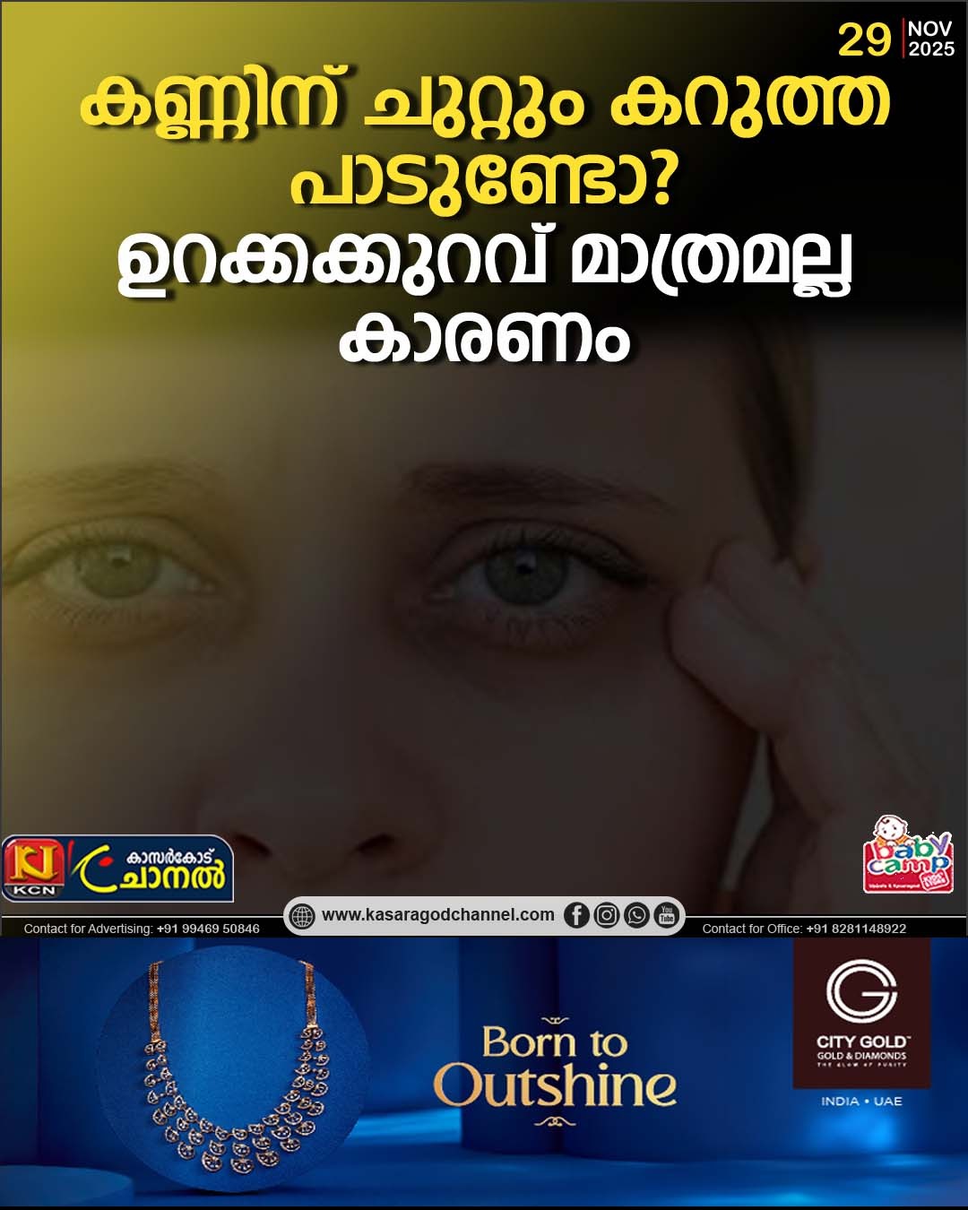 കണ്ണുകള്ക്ക് ചുറ്റുമുള്ള കറുത്ത നിറം രാത്രി വൈകിയുള്ള ഉറക്കത്തിന്റെ ലക്ഷണം മാത്രമല്ല. ഇരുമ്പിന്റെ കുറവ് പോലുള്ള ഗുരുതരമായ ആരോഗ്യപ്രശ്നങ്ങള് കൂടിയാണെന്ന് ഡോക്ടര്മാര് പറയുന്നു. അയണിന്റെ കുറവ് ശരീരത്തിലെ ഏറ്റവും കനം കുറഞ്ഞ ചര്മ്മമായ കണ്ണുകള്ക്ക് ചുറ്റുമുള്ള ഭാഗത്ത് കൂടുതല് ദൃശ്യമാകുന്നു. അയണിന്റെ അളവ് കുറയുമ്പോള് മുടികൊഴിയുകയും, നഖം പൊട്ടുകയും ചെയ്യുന്നതുപോലെ തന്നെ ശരീരം കാണിച്ചുതരുന്ന മറ്റൊരു ലക്ഷണമാണ് കണ്ണിന് ചുറ്റുമുള്ള കറുത്ത പാട്.