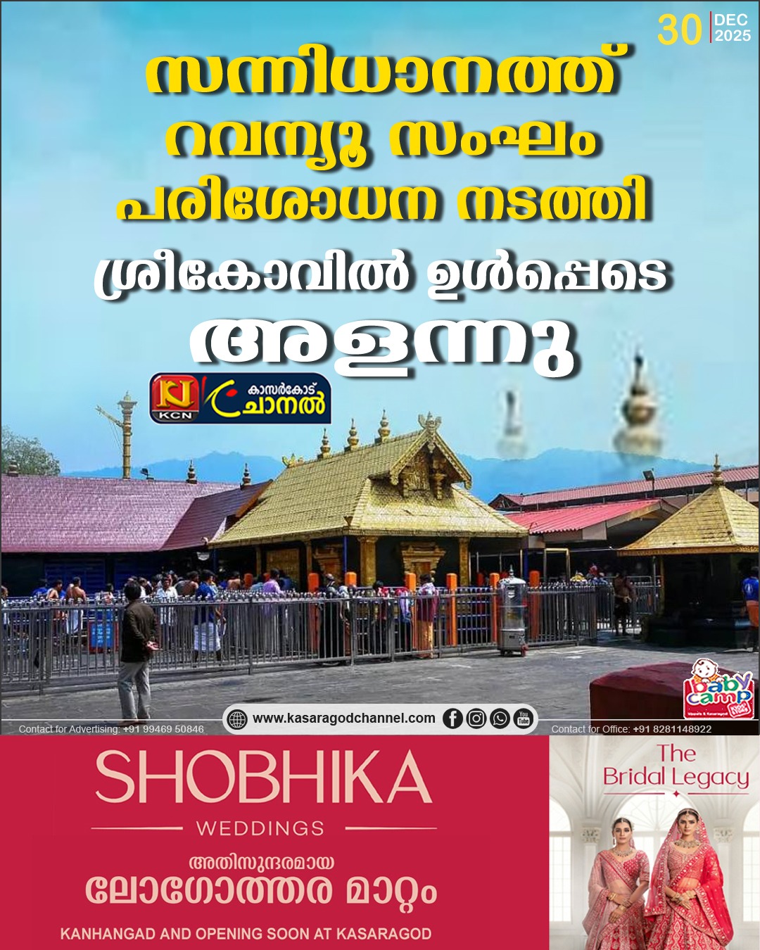ശബരിമല സ്വര്ണക്കൊള്ളയുമായി ബന്ധപ്പെട്ട് സന്നിധാനത്ത് റവന്യൂ സംഘം പരിശോധന നടത്തി. എസ്ഐടി നല്കിയ മഹസര് പ്രകാരം ശ്രീകോവില് ഉള്പ്പെടെ അളന്നു.പെരുനാട് വില്ലേജ് ഓഫീസറുടെ നേതൃത്വത്തില് ആണ് പരിശോധന നടത്തിയത്.എസ്ഐടി നിര്ദേശപ്രകാരമാണ് അളവെടുത്തത്. സീന് പ്ലാന് രണ്ട് ദിവസത്തിനകം എസ്ഐടിക്ക് നല്കുമെന്ന് റവന്യൂ സംഘം അറിയിച്ചു. ഈ സീന് പ്ലാനാണ് എസ്ഐടി ഹൈക്കോടതിയില് സമര്പ്പിക്കുക.