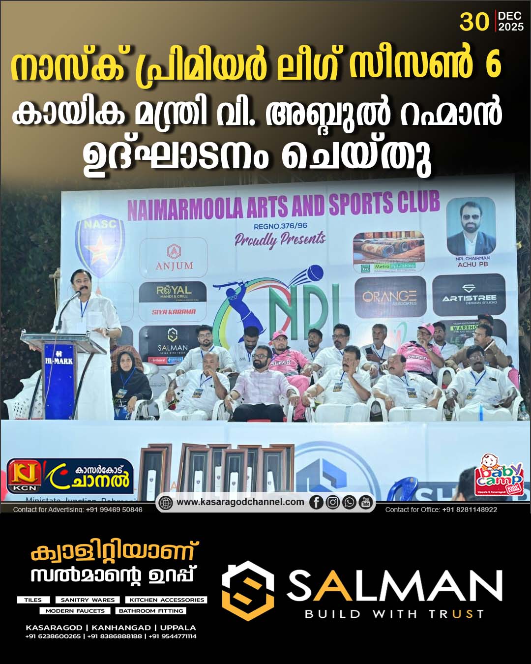 നയൻമാർമൂല: നാസ്ക് നയൻമാർമൂലയുടെ ആഭിമുഖ്യത്തിൽ സംഘടിപ്പിച്ച നാസ്ക് പ്രിമിയർ ലീഗ് (NPL) – സീസൺ 6 ക്രിക്കറ്റ് ടൂർണമെന്റ് കായിക മന്ത്രി വി. അബ്ദുൽ റഹ്മാൻ ഉദ്ഘാടനം ചെയ്തു. നയൻമാർമൂല മിനി സ്റ്റേഡിയത്തിൽ നടന്ന ചടങ്ങിൽ കായിക–സാമൂഹിക രംഗങ്ങളിൽ നാസ്ക് നടത്തിയ സംഭാവനകൾ മന്ത്രി പ്രശംസിച്ചു.