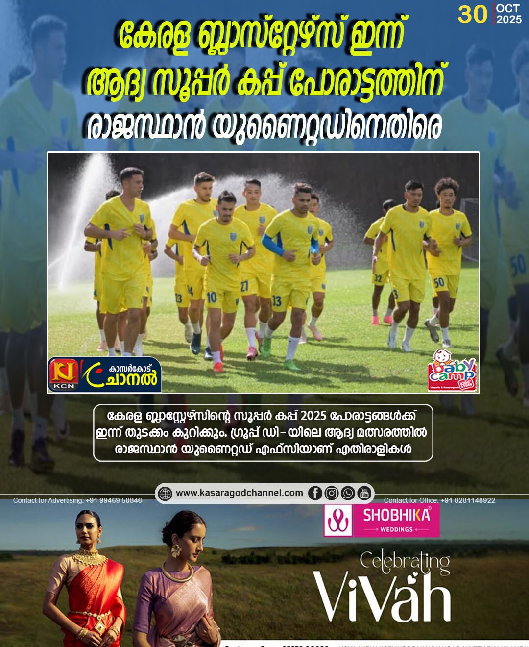 ഫറ്റോര്ഡ: കേരള ബ്ലാസ്റ്റേഴ്സിന്റെ സൂപ്പര് കപ്പ് 2025 പോരാട്ടങ്ങള്ക്ക് ഇന്ന് തുടക്കം കുറിക്കും. ഗ്രൂപ്പ് ഡി-യിലെ ആദ്യ മത്സരത്തില് രാജസ്ഥാന് യുണൈറ്റഡ് എഫ്സിയാണ് എതിരാളികള്. ബാംബോളിമിലെ ജി എം സി അത്ലറ്റിക് സ്റ്റേഡിയത്തില് വെച്ച് വൈകുന്നേരം 4:30 നാണ് മത്സരം. ഇരു ടീമുകളും ആദ്യമായാണ് നേര്ക്കുനേര് വരുന്നത്, ടൂര്ണമെന്റില് വിജയകരമായ തുടക്കം തേടുന്ന ഇരു ടീമുകള്ക്കും ഈ മത്സരം നിര്ണ്ണായകമാണ്. പുതിയ വിദേശ സൈനിംഗുകളും ഇന്ത്യന് യുവതാരങ്ങളും ഉള്പ്പെട്ട പരിഷ്കരിച്ച സ്ക്വാഡുമായാണ് ബ്ലാസ്റ്റേഴ്സ് ഗോവയില് എത്തിയിരിക്കുന്നത്.