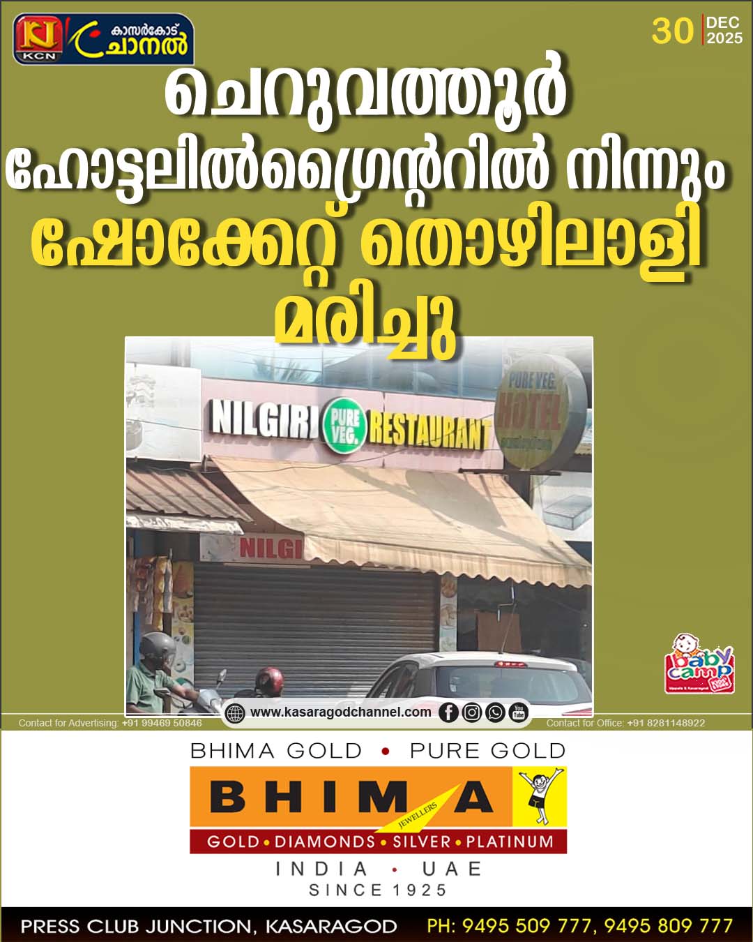 ചെറുവത്തൂര് ഹോട്ടലില്ഗ്രൈന്ററില് നിന്നും ഷോക്കേറ്റ് തൊഴിലാളി മരിച്ചു