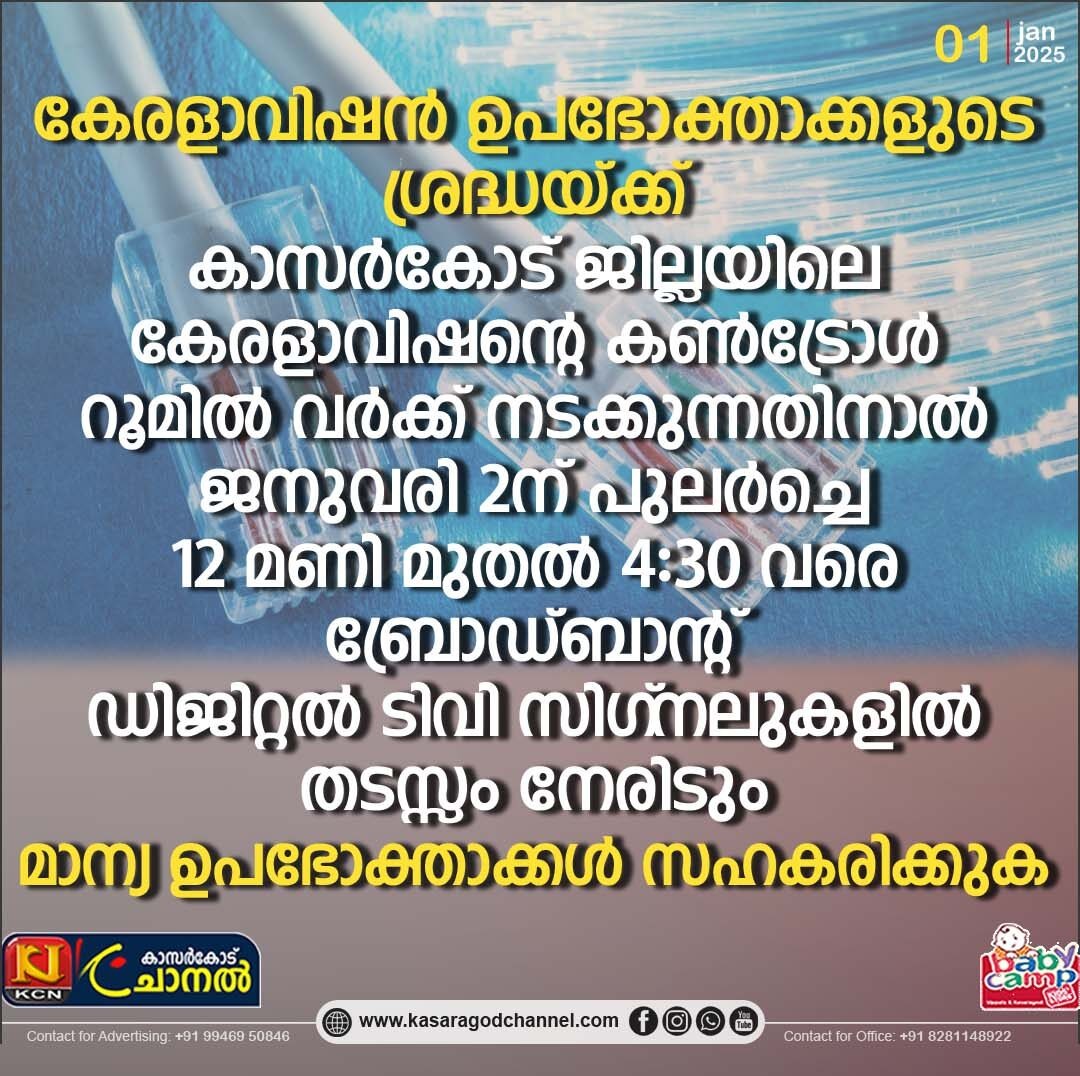 കേരളാവിഷന് ഉപഭോക്താക്കളുടെ ശ്രദ്ധയ്ക്ക്, കാസര്കോട് ജില്ലയിലെ കേരളാവിഷന്റെ കണ്ട്രോള് റൂമില് വര്ക്ക് നടക്കുന്നതിനാല് ജനുവരി 2ന് പുലര്ച്ചെ 12 മണി മുതല് 4:30 വരെ ബ്രോഡ്ബാന്റ്, ഡിജിറ്റല് ടിവി സിഗ്നലുകളില് തടസ്സം നേരിടും. മാന്യ ഉപഭോക്താക്കള് സഹകരിക്കുക.