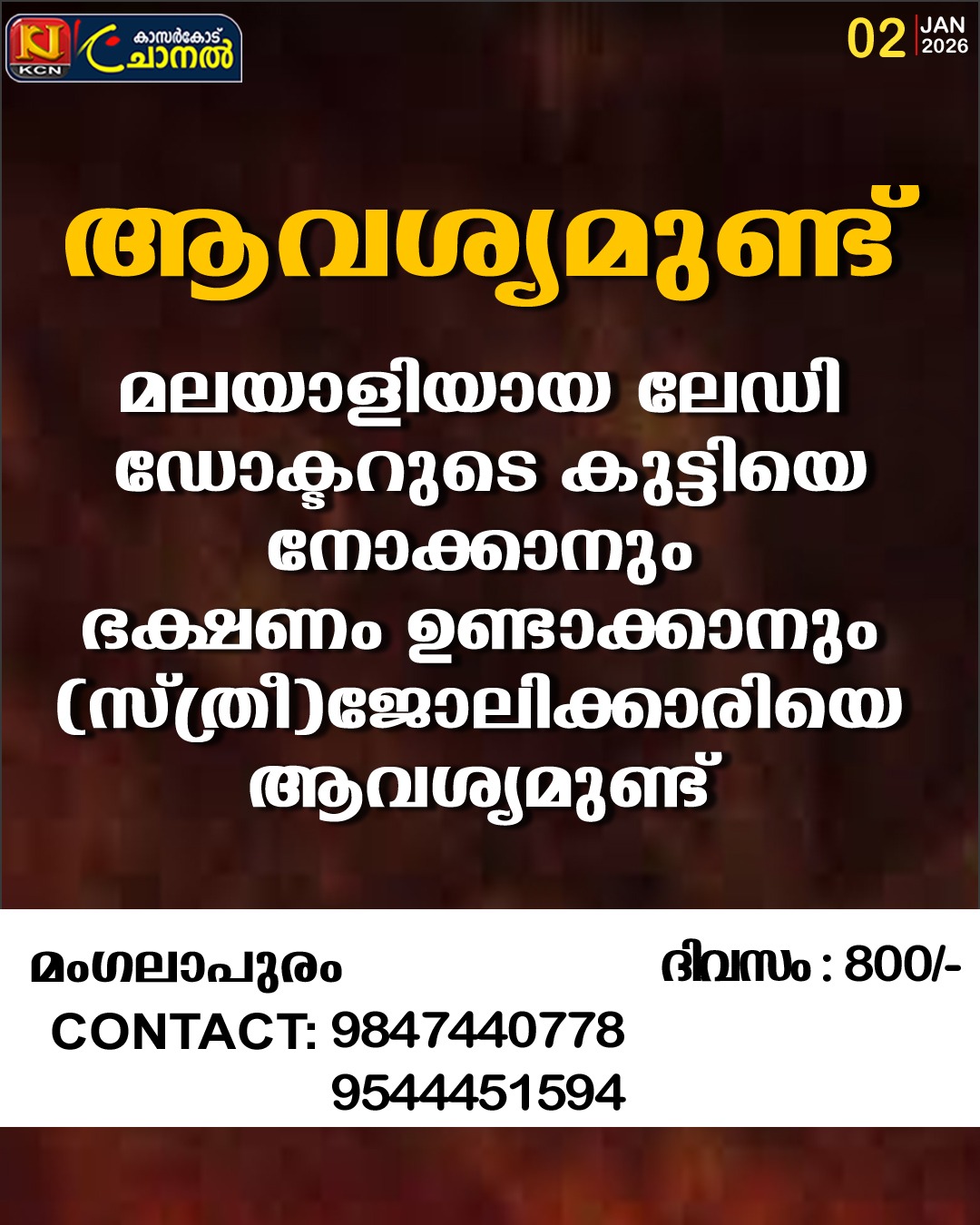 മലയാളിയായ ലേഡി ഡോക്ടറുടെ കുട്ടിയെ നോക്കാനും ഭക്ഷണം ഉണ്ടാക്കാനും (സ്ത്രീ)ജോലിക്കാരിയെ ആവശ്യമുണ്ട്.
