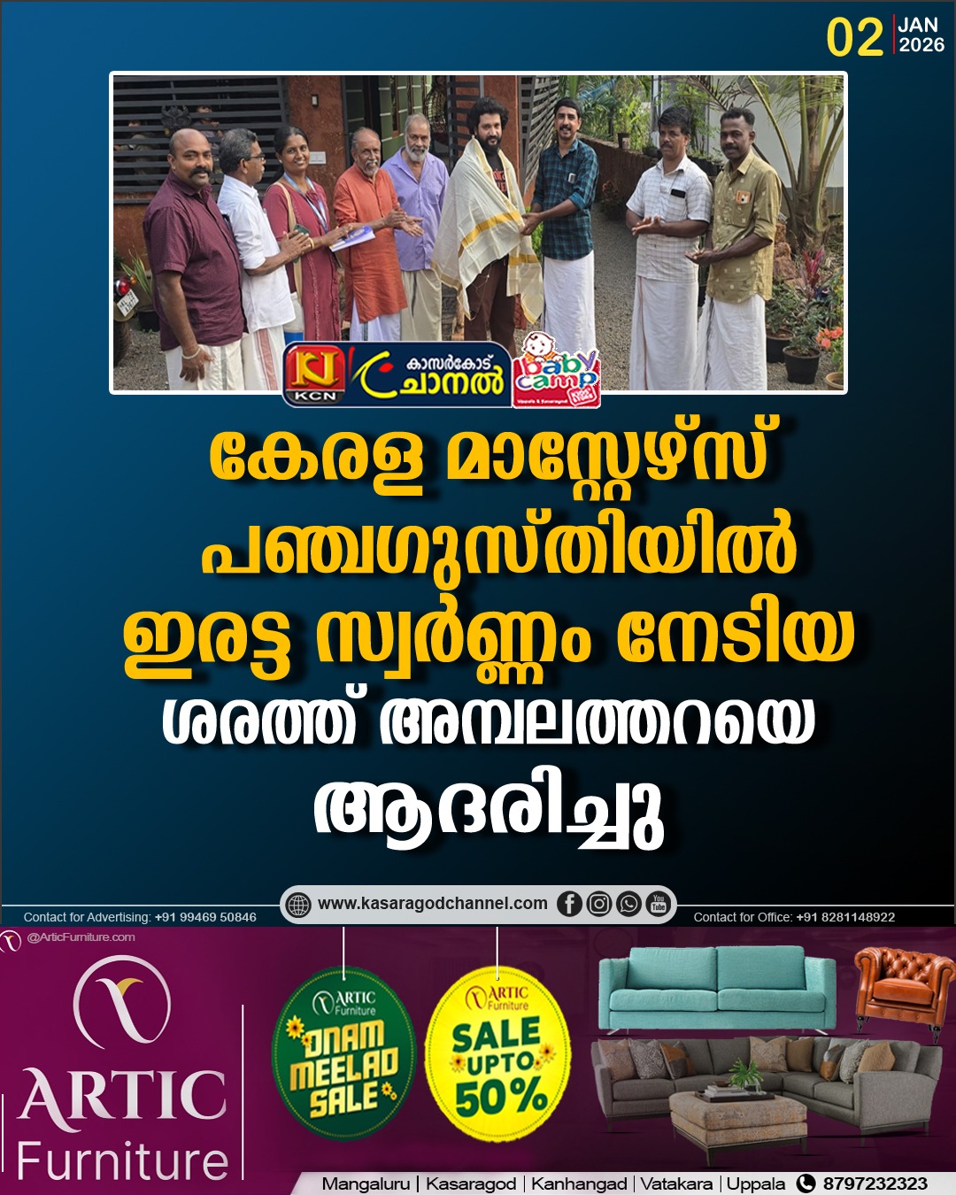 2025 തൃശൂരില് വെച്ചു നടന്ന കേരള മാസ്റ്റേഴ്സ് പഞ്ചഗുസ്തി മത്സരത്തില് കാസര്ഗോഡ് ജില്ലയ്ക്കു വേണ്ടി ഇരട്ട സ്വര്ണ്ണം നേടിയ ശരത്ത് അമ്പലത്തറയ്ക്ക് ഇരുപതാം വാര്ഡ് കമ്മിറ്റയുടെ നേതൃത്വത്തില് തട്ടുമ്മലിലെ വീട്ടില് വെച്ച് ആദരിച്ചു.കോടോം ബേളൂര് ഗ്രാമപഞ്ചായത്ത് ഇരുപതാം വാര്ഡ് മെമ്പര് സുരേഷ് വയമ്പ് പൊന്നാട അണിയിച്ചു.പഞ്ചായത്ത് RP രാമചന്ദ്രന് മാഷ്, വാര്ഡ് സമിതി അംഗങ്ങളായ കുഞ്ഞികൃഷ്ണന് കെ എം, അച്യുതന്. ടി, മുഹമ്മദ് കുഞ്ഞി പി. എന്, ജയകുമാര്.പി, ശിവകുമാര്. കെ,ജ്യോതിലക്ഷ്മി എന്നിവര് പങ്കെടുത്തു. ജനുവരിയില് പൂനെയില് വെച്ചു നടക്കുന്ന ദേശീയ മാസ്റ്റേഴ്സ് മത്സരത്തില് ശരത്ത് കേരളത്തെ പ്രേതിനിധികരിക്കും.