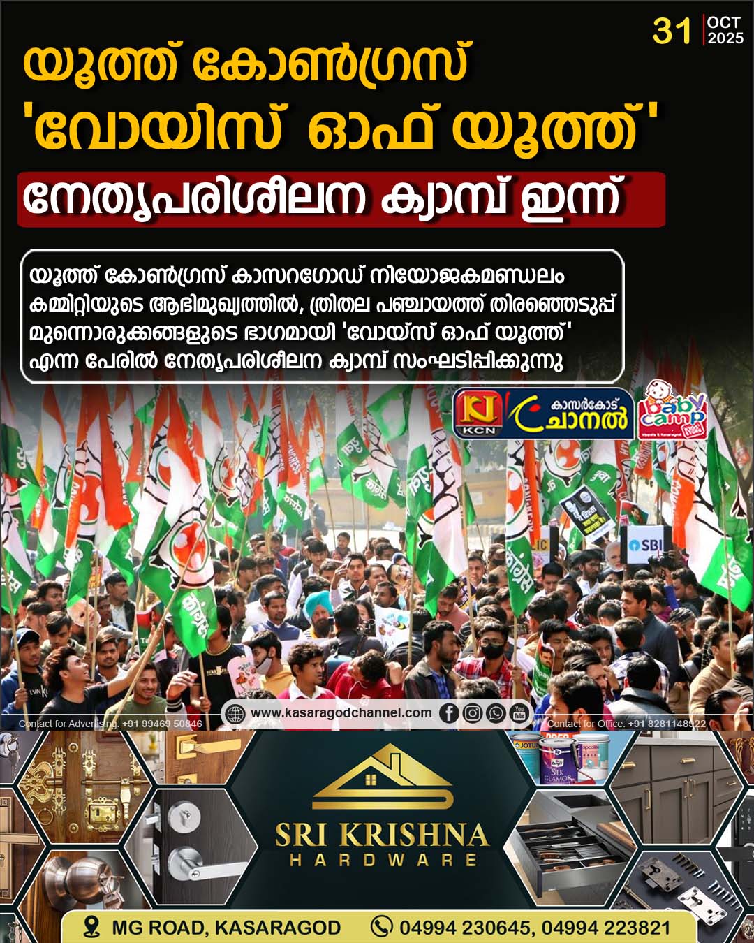 യൂത്ത് കോണ്ഗ്രസ് കാസറഗോഡ് നിയോജകമണ്ഡലം കമ്മിറ്റിയുടെ ആഭിമുഖ്യത്തില്, ത്രിതല പഞ്ചായത്ത് തിരഞ്ഞെടുപ്പ് മുന്നൊരുക്കങ്ങളുടെ ഭാഗമായി ‘വോയ്സ് ഓഫ് യൂത്ത്’ എന്ന പേരില് നേതൃപരിശീലന ക്യാമ്പ് സംഘടിപ്പിക്കുന്നു.