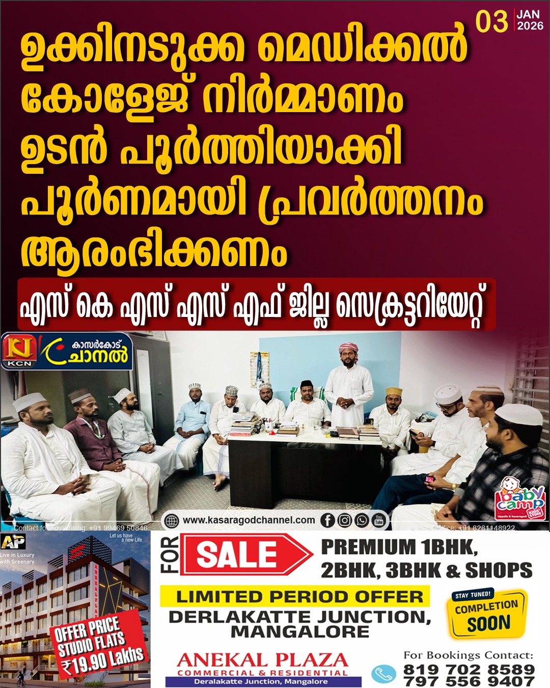 കാസര്കോട്: ഏറെ നാളുകളായി നീണ്ടുപോരുന്ന ഉക്കിനടുക്ക മെഡിക്കല് കോളേജിന്റെ നിര്മാണവും അടിസ്ഥാന സൗകര്യ വികസന പ്രവര്ത്തനങ്ങളും അടിയന്തരമായി പൂര്ത്തിയാക്കി പൂര്ണ്ണമായ രോഗി പരിചരണ സംവിധാനം ആരംഭിക്കാന് സര്ക്കാര് ത്വരിത നടപടി സ്വീകരിക്കണമെന്ന് എസ് കെ എസ് എസ് എഫ് കാസര്കോട് ജില്ലാ സെക്രട്ടറിയേറ്റ് ആവശ്യപ്പെട്ടു.