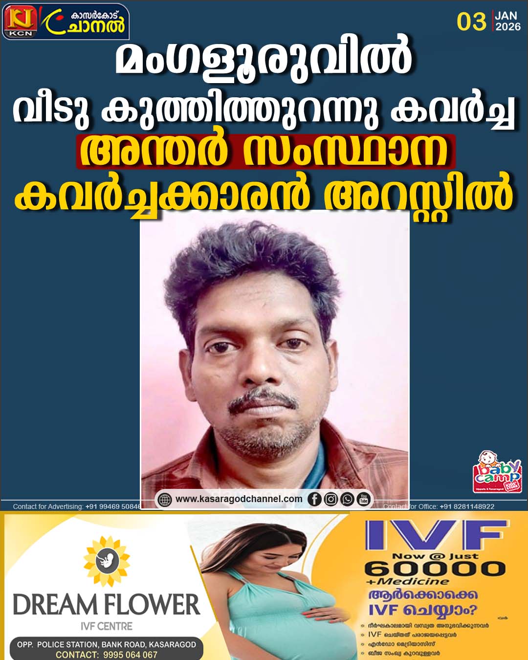 വീടു കുത്തിത്തുറന്നു 72 ഗ്രാം സ്വര്ണ്ണവും വെള്ളി ആഭരണങ്ങളും കവര്ച്ച ചെയ്ത കേസില് അന്തര് സംസ്ഥാന കവര്ച്ചക്കാരന് അറസ്റ്റില്.