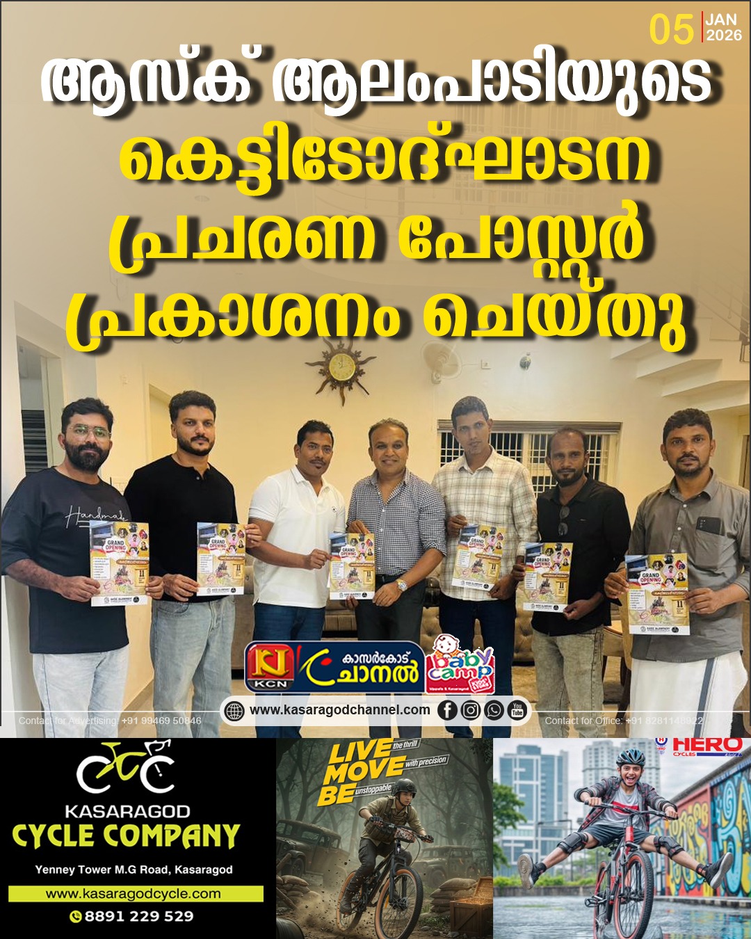 ആസ്ക് ആലംപാടി കെട്ടിടം ഉദ്ഘാടനം ജനുവരി 11ന് ഞായറാഴ്ച വൈകുന്നേരം 4 മണിക്ക് പ്രസക്ത മജീഷ്യന് ഗോപിനാഥ് മുതുകാട് ഉദ്ഘാടനം ചെയ്യും അതിന്റെ പ്രചരണ പോസ്റ്റര് ജാക് ചെമ്പരിക്ക (ഡയറക്ടര് വെല്കിന്സ് ക്യാപിറ്റല്) പ്രകാശനം ചെയ്തു, ക്ലബ്ബ് അംഗങ്ങളായ മുഹമ്മദ് കാര്,കൈസ് മിഹ്റാജ്, അദ്ര മേനത്, ആസിഫ് ബി എ,മുസ്തഫ ഇ എ, ഗപ്പു ആലംപാടി, എന്നിവര് ചടങ്ങില് സംബന്ധിച്ചു