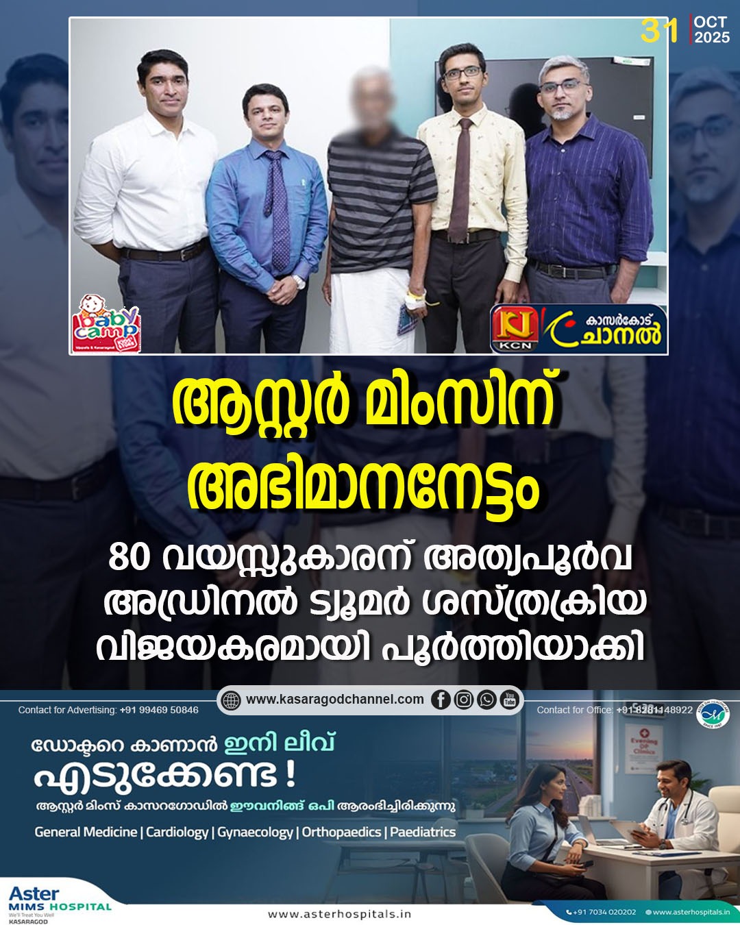 കാസര്കോട്: വെല്ലുവിളികള്ക്ക് മുന്പില് മെഡിക്കല് മികവ് ഒരിക്കല് കൂടി വിജയം നേടി. ഹൃദയ വാല്വ് മാറ്റിയതടക്കം ഗുരുതരമായ ആരോഗ്യ പ്രശ്നങ്ങള് നേരിട്ടിരുന്ന 80 വയസ്സുകാരന് കാസര്കോട് ആസ്റ്റര് മിംസ് ആശുപത്രിയില് ലാപ്രോസ്കോപിക് അഡ്രിനലക്ടമി (വയറു തുറക്കാതെ താക്കോല്ദ്വാര ശസ്ത്രക്രിയ വഴി അഡ്രിനല് ഗ്രന്ഥിയും ട്യൂമറും നീക്കം ചെയ്യല്) വിജയകരമായി പൂര്ത്തിയാക്കി. ഈ സങ്കീര്ണമായ ശസ്ത്രക്രിയയിലൂടെ കാസര്കോട് ജില്ലയുടെ ആരോഗ്യരംഗത്തെ മെഡിക്കല് മികവ് ആസ്റ്റര് മിംസ് വീണ്ടും അടയാളപ്പെടുത്തി.