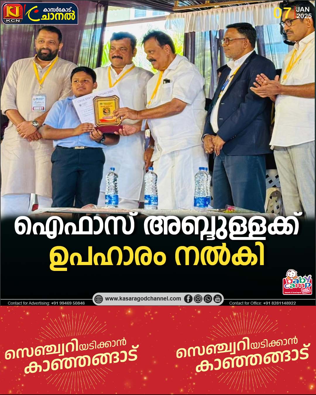 കോട്ടയം ലേബര് ഇന്ത്യ പബ്ലിക് സ്കൂളില് നടന്ന സംസ്ഥാന സിബിഎസ്ഇ സ്കൂള് കലോത്സവത്തില് ഇംഗ്ലീഷ് പ്രസംഗ മത്സരത്തില് എ ഗ്രേഡ് കരസ്തമാക്കിയ ഐഫാസ് അബ്ദുള്ളക്ക് എന് എ നെല്ലിക്കുന്ന് എം എല് എ ഉപഹാരം നല്കി . മൈ സ്ക്രീന് ടൈം സ്റ്റോറി എന്ന വിഷയത്തിലാണ് ഐഫാസ് പരിപാടി അവതരിപ്പിച്ചത്.കഴിഞ്ഞ രണ്ടു വര്ഷമായി ഐഫാസ് ജില്ലാ വേദികളില് തിളങ്ങി നില്കുന്നു. കെ എസ് അബ്ദുല്ല ഇംഗ്ലീഷ് മീഡിയം സ്കൂളിലെ നാലാം തരം വിദ്യാര്ഥിയാണ് . ബിസിനസ്കാരനും പൊതുപ്രവര്ത്തകനുമായ മുട്ടതൊടി ഹിദായത്ത് നാഗറിലെ അഷ്റഫ് പാറ യുടെയും ഹാജിറ യുടെയും മകനാണ്