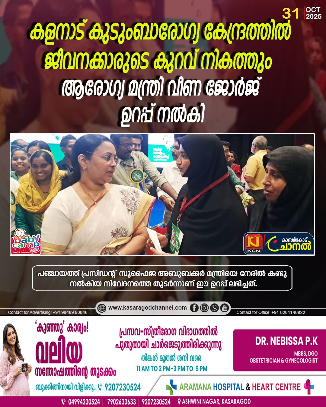 സൗകര്യമുള്ള കെട്ടിടവും അടിസ്ഥാന സൗകര്യങ്ങളും ഉണ്ടായിട്ടും, ജീവനക്കാരുടെ കുറവ് മൂലം പ്രദേശവാസികള്ക്ക് ചികിത്സാ സേവനങ്ങള് ലഭ്യമാക്കുന്നതില് ബുദ്ധിമുട്ടുകള് നേരിടുന്ന സാഹചര്യം പ്രസിഡന്റ് മന്ത്രിയുടെ ശ്രദ്ധയില്പ്പെടുത്തിയിരുന്നു.