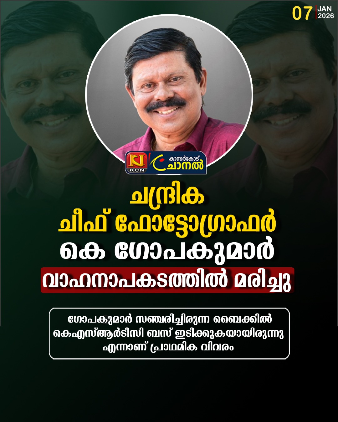 ചന്ദ്രിക ചീഫ് ഫോട്ടോഗ്രാഫര് കെ ഗോപകുമാര് വാഹനാപകടത്തില് മരിച്ചു.
