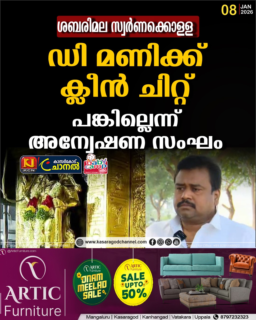കൊച്ചി: ശബരിമല സ്വര്ണക്കൊള്ളയില് തമിഴ്നാട് വ്യവസായി ഡി മണിക്ക് ക്ലീന് ചിറ്റ്. ഇയാള്ക്ക് കൊള്ളയുമായി ബന്ധമില്ലെന്ന് അന്വേഷണ സംഘം ഹൈക്കോടതിയില് നല്കിയ റിപ്പോര്ട്ടില് പറയുന്നു.