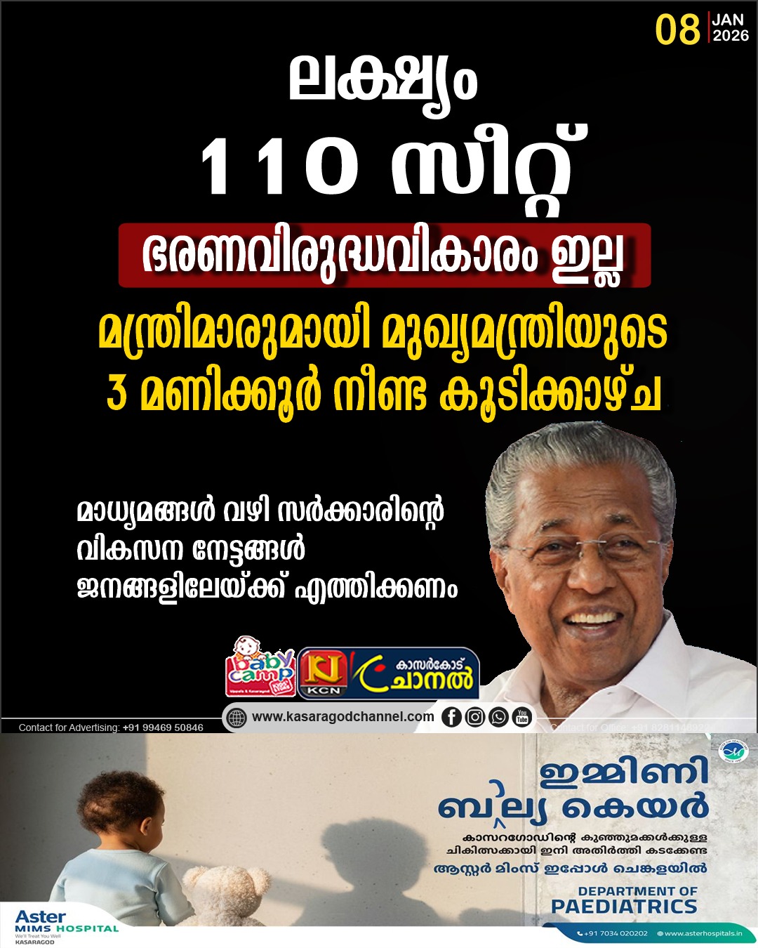 മാധ്യമങ്ങള് വഴി സര്ക്കാരിന്റെ വികസന നേട്ടങ്ങള് ജനങ്ങളിലേയ്ക്ക് എത്തിക്കണം. രാജ്യത്തെ രാഷ്ട്രീയ സാഹചര്യം വോട്ടര്മാരിലേക്ക് എത്തിക്കണം. രാജ്യത്തെ ഏക ഇടതുപക്ഷ സര്ക്കാരാണ് കേരളത്തിലേതെന്നും വര്ഗീയ ഫാസിസത്തിനെതിരെ പൊരുതുന്നത് കേരളം മാത്രമാണ് പ്രചാരണായുധമാക്കാനും മുഖ്യമന്ത്രി നിര്ദേശിച്ചു.