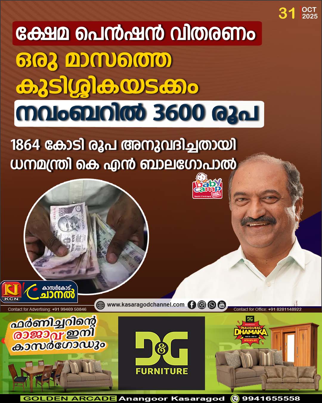 ‘നവംബര് 20 മുതല് പെന്ഷന് വിതരണം ആരംഭിക്കും. വര്ധിപ്പിച്ച പെന്ഷന് വിതരണത്തിന് 1042 കോടി രൂപയും, ഒരു ഗഡു കുടിശ്ശിക വിതരണത്തിന് 824 കോടി രൂപയുമാണ് അനുവദിച്ചത്. ഇതോടെ ക്ഷേമ പെന്ഷന് കുടിശിക പൂര്ണമായും കൊടുത്തു തീര്ക്കുകുകയാണെന്നും ധന മന്ത്രി വ്യക്തമാക്കി.’