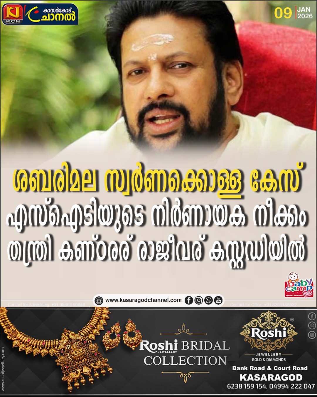 തിരുവനന്തപുരം:ശബരിമല സ്വര്ണക്കൊള്ള കേസില് ശബരിമല തന്ത്രി കണ്ഠരര് രാജീവര് കസ്റ്റഡിയില്. പ്രത്യേക അന്വേഷണ സംഘമാണ് തന്ത്രിയെ കസ്റ്റഡിയില് എടുത്തത്. പോറ്റിക്ക് വാതില് തുറന്ന് കൊടുത്തത് തന്ത്രിയാണെന്നാണ് അന്വേഷണ സംഘത്തിന് ലഭിച്ച വിവരം. തന്ത്രി ദേവസ്വം ബോര്ഡില് നിന്നും ശമ്പളം കൈപ്പറ്റുന്നയാളെന്നും അഴിമതി നിരോധന പരിധിയിലും തന്ത്രി ഉള്പ്പെടു,o പോറ്റി സ്വര്ണ തട്ടിപ്പ് നടത്തിയ വിവരം തന്ത്രിക്കറിയാമായിരുന്നു എന്നുള്ള വിവരങ്ങളും അന്വേഷണ സംഘത്തിന് ലഭിച്ചിട്ടുണ്ട്.