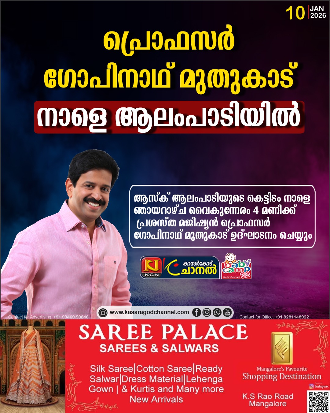 കാസറഗോഡ്: ആസ്ക് ആലംപാടിയുടെ കെട്ടിടം നാളെ ഞായറാഴ്ച വൈകുന്നേരം 4 മണിക്ക് പ്രശസ്ത മജീഷ്യന് പ്രൊഫസര് ഗോപിനാഥ് മുതുകാട് ഉദ്ഘാടനം ചെയ്യും തുടര്ന്ന് നടക്കുന്ന സാംസ്കാരിക സമ്മേളനം എന് എ നെല്ലിക്കുന്നു എം എല് എ ഉദ്ഘാടനം ചെയ്യും, ചടങ്ങില് സി എച്ച് കുഞ്ഞമ്പു എം എല് എ, എ കെ എം അഷ്റഫ് എം എല് എ, ജില്ലാ പഞ്ചായത്ത് പ്രസിഡന്റ് സാബു എബ്രഹാം, മറ്റു പ്രമുഖ വ്യക്തിതങ്ങള് സംബന്തിക്കും, തുടര്ന്ന് 6 മണിമുതല് പ്രസക്ത ഗായിക യുംന അജിന്,ആസിഫ് കാപ്പാട്, ജാസ് അസ്ലം എന്നിവര് നയിക്കുന്ന ആസ്ക് ആലംപാടി ഉത്സവ് അരങ്ങേറും
