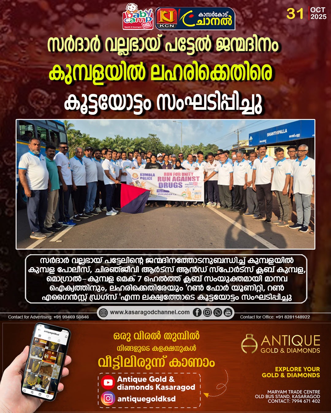 കുമ്പള: സര്ദാര് വല്ലഭായ് പട്ടേലിന്റെ ജന്മദിനത്തോടനുബന്ധിച്ച് കുമ്പളയില് കുമ്പള പോലീസ്, ചിരഞ്ജീവി ആര്ട്സ് ആന്ഡ് സ്പോര്ട്സ് ക്ലബ് കുമ്പള, മൊഗ്രാല്-കുമ്പള മെക് 7 ഹെല്ത്ത് ക്ലബ് സംയുക്തമായി മാനവ ഐക്യത്തിനും, ലഹരിക്കെതിരേയും ‘റണ് ഫോര് യൂണിറ്റി, റണ് എഗൈന്സ്റ്റ് ഡ്രഗ്സ് ‘എന്ന ലക്ഷ്യത്തോടെ കൂട്ടയോട്ടം സംഘടിപ്പിച്ചു. നൂറുകണക്കിനാളുകള് പങ്കെടുത്തു.