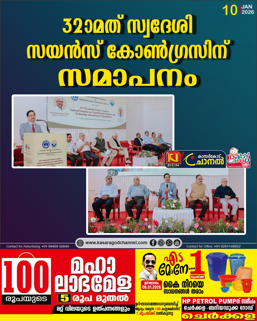 പെരിയ: ഭാവി ഭാരതത്തിന്റെ ശാസ്ത്ര സാങ്കേതിക മുന്നേറ്റത്തിന്റെ ചാലകശക്തിയാകാന് യുവഗവേഷകരെ സന്നദ്ധരാക്കി 32ാമത് സ്വദേശി സയന്സ് കോണ്ഗ്രസിന് സമാപനം. കേരള കേന്ദ്ര സര്വകലാശാലയും സ്വദേശി ശാസ്ത്ര പ്രസ്ഥാനം – കേരളയും സംയുക്തമായി പെരിയ ക്യാമ്പസില് സംഘടിപ്പിച്ച മൂന്ന് ദിവസത്തെ സമ്മേളനം ആശയങ്ങളുടെ സമ്മേളനമായി മാറി. വികസിത ഭാരതത്തിനായുള്ള ശാസ്ത്ര സാങ്കേതിക വിദ്യാഭ്യാസം എന്ന വിഷയത്തില് വിവിധ മേഖലകളായി തിരിച്ച് നടന്ന ചര്ച്ചയും സംവാദവും ഭാവിയുടെ പ്രതിഫലനം കൂടിയായിരുന്നു. ആറ് വേദികളിലായി അരങ്ങേറിയ വിവിധ സെഷനുകളില് മൂന്നൂറിലേറെ ശാസ്ത്രജ്ഞരും ഗവേഷകരും സംബന്ധിച്ചു. 238 പ്രബന്ധ, പോസ്റ്റര് അവതരണങ്ങളും നടന്നു.