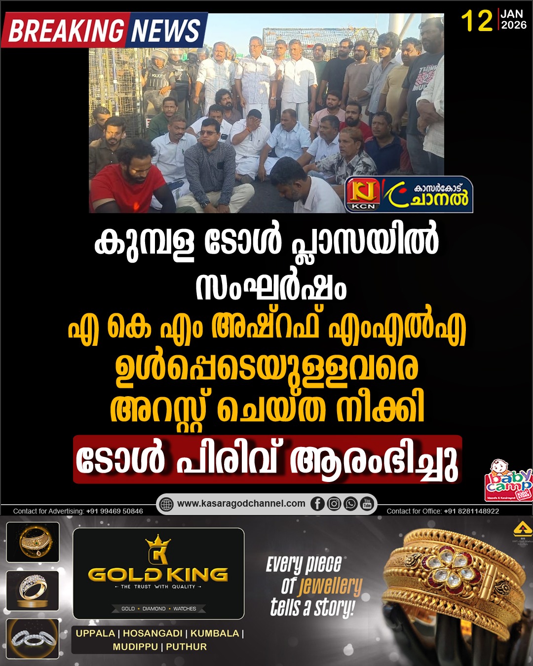 കുമ്പള ടോള് പ്ലാസയില് സംഘര്ഷം;എ കെ എം അഷ്റഫ് എംഎല്എ ഉള്പ്പെടെയുള്ളവരെ അറസ്റ്റ് ചെയ്ത നീക്കി,ടോള് പിരിവ് ആരംഭിച്ചു