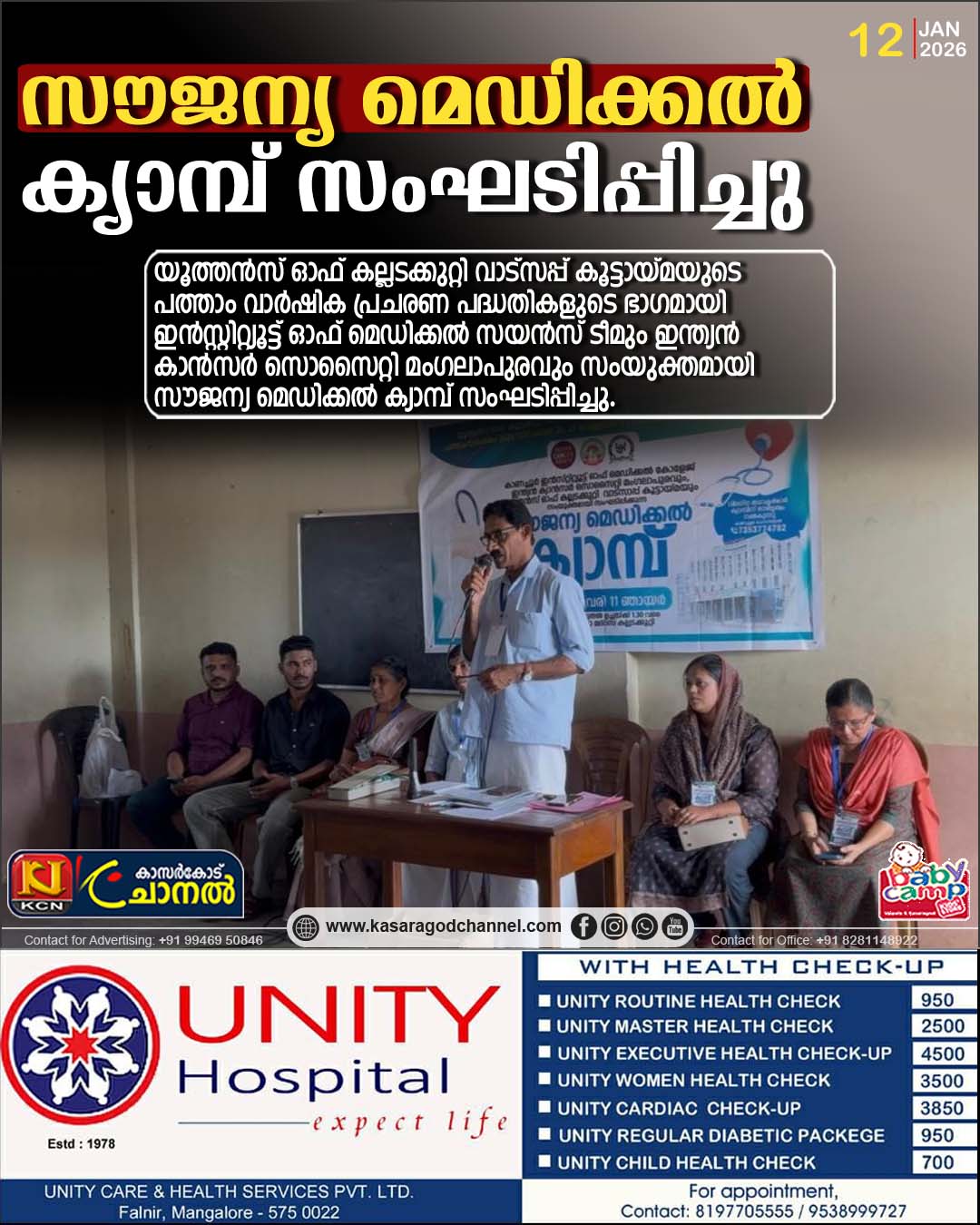 കല്ലടക്കുറ്റി: യൂത്തന്സ് ഓഫ് കല്ലടക്കുറ്റി വാട്സപ്പ് കൂട്ടായ്മയുടെ പത്താം വാര്ഷിക പ്രചരണ പദ്ധതികളുടെ ഭാഗമായി ഇന്സ്റ്റിറ്റ്യൂട്ട് ഓഫ് മെഡിക്കല് സയന്സ് ടീമും ഇന്ത്യന് കാന്സര് സൊസൈറ്റി മംഗലാപുരവും സംയുക്തമായി സൗജന്യ മെഡിക്കല് ക്യാമ്പ് സംഘടിപ്പിച്ചു. കല്ലടക്കുറ്റി ജമാഅത്ത് ഇംഗ്ലീഷ് മീഡിയം സ്കൂളില് നടന്ന പരിപാടി പ്രസിഡന്റ് ഫാറൂഖ് കല്ലടകുറ്റി യുടെ അധ്യക്ഷതയില് ബേഡഡുക്ക ഗ്രാമപഞ്ചായത്ത് പ്രസിഡന്റ് ഇ. കുഞ്ഞിരാമന് ഉദ്ഘാടനം ചെയ്തു. സമൂഹത്തിന് മാതൃകാപരമായ ഒരു പ്രവര്ത്തനമാണ് ഇതെന്ന് മുഖ്യാതിഥിയായ താലൂക്ക് ആശുപത്രി ജൂനിയര് ഹെല്ത്ത് നേഴ്സ് ശ്രീമതി റീന അഭിപ്രായപ്പെട്ടു. നാലാം വാര്ഡ് മെമ്പര് ഹനീഫ കരിയത്ത് മൂന്നാം വാര്ഡ് മെമ്പര് ശ്രീമതി ശാന്തകുമാരി മുന് മെമ്പര് നൂര്ജഹാന് തുടങ്ങിയവര് സംസാരിച്ചു.