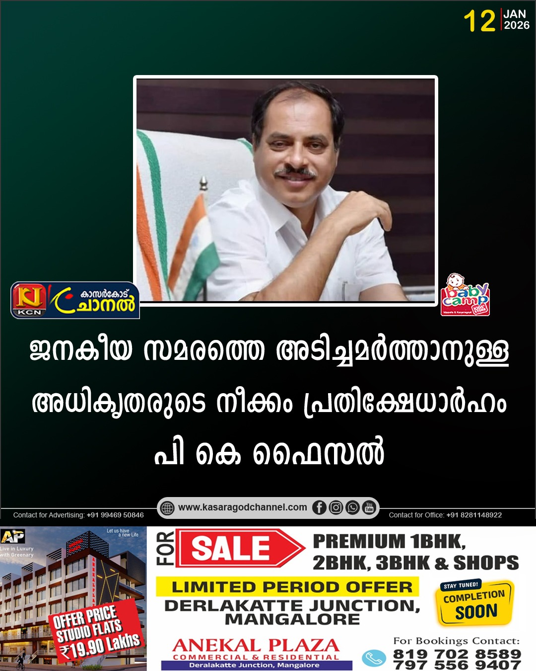 ദേശിയപാതയുടെ പ്രവൃത്തി പൂര്ത്തീകരിക്കുന്നതിനു മുമ്പേ അറുപത് കിലോമീറ്റര് പരിധിക്കകത്ത് ഒന്നില് കൂടുതല് ടോള് ബൂത്തുകള് സ്ഥാപിക്കാന് പാടില്ലെന്ന വ്യവസ്ഥയെ കാറ്റില് പറത്തി തലപ്പാടി ടോള് ബൂത്തിന്റെ ഏതാനും കിലോമീറ്റര് മാത്രം ദൂരമുള്ള കുമ്പള ഹൈവേയില് ടോള് ബൂത്ത് പ്രവര്ത്തനമാരംഭിച്ച അധികൃതരുടെ നടപടിക്കെതിരെ മഞ്ചേശ്വരം എം.എല്.എ എ കെ എം അഷറഫിന്റെ നേതൃത്വത്തില് നടക്കുന്ന ജനകീയ സമരത്തെ പൊലിസിനെ ഉപയോഗിച്ച് അടിച്ചമര്ത്താനുള്ള ഗവണ്മെന്റ് നടപടിയില് കാസര്ഗോഡ് ഡിസിസി പ്രസിഡണ്ട് പി കെ ഫൈസല് പ്രതിക്ഷേധം രേഖപ്പെടുത്തി. ടോള് പിരിവ് സംബന്ധിച്ച് ഹൈക്കോടതിയില് അപ്പീല് നില നില്ക്കുമ്പോള് തികച്ചും ജനാധിപത്യ വിരുദ്ധമായി ടോള് പ്രവര്ത്തനം തുടങ്ങിയതിനെതിരെ നടത്തുന്ന ജനകീയ സമരത്തിന് ശക്തമായ പിന്തുണ അറിയിക്കുന്നതായും ഡിസിസി പ്രസിഡണ്ട് പി കെ ഫൈസല് പറഞ്ഞു.